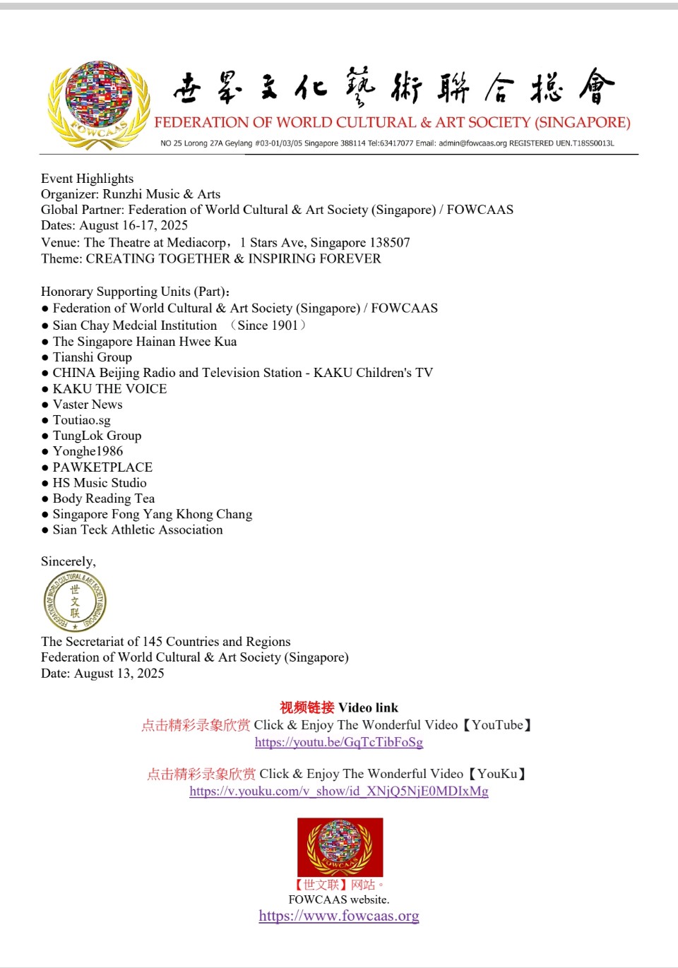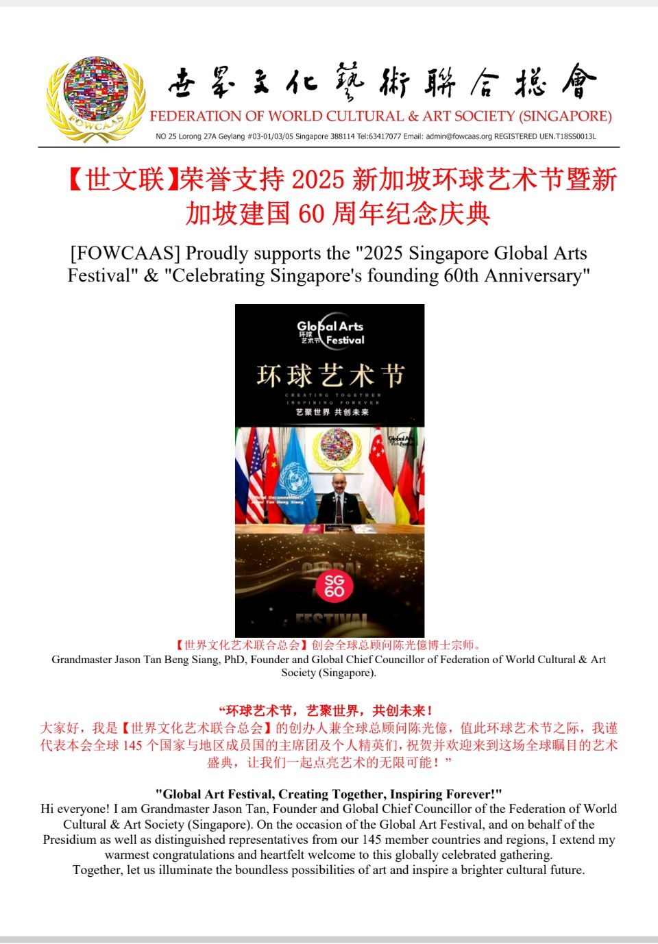 [FOWCAAS] Proudly supports the "2025 Singapore Global Arts Festival" & "Celebrating Singapore's founding 60th Anniversary"