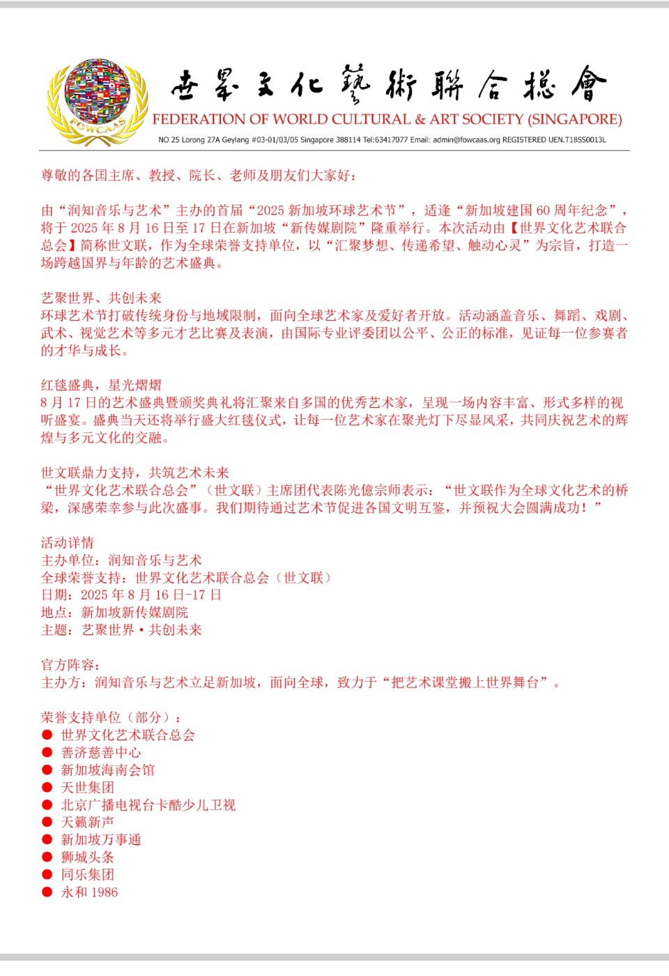 【世文联】荣誉支持2025新加坡环球艺术节暨新加坡建国60周年纪念庆典