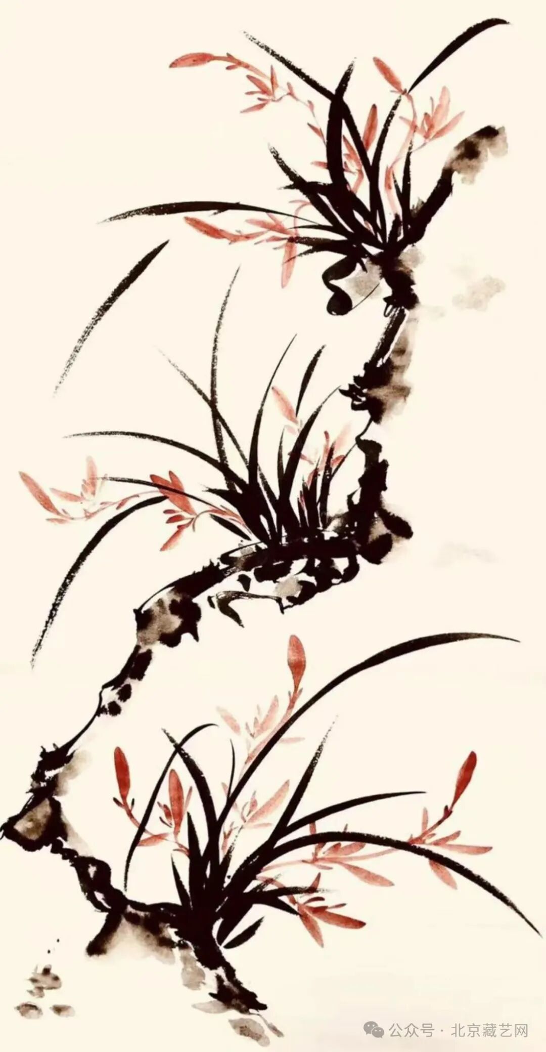就比如说他的几幅设色兰花作品,画中兰花,时而见一束长于奇石,时而又见两三束上下承接,用笔首以中锋行运,是谓入笔有力,飞白出锋,其中有使转更有收纵!所绘兰叶皆是舒展有致,穿插之余尽显变化多端,是取婀娜姿态,也见君子雅风。而在用色方面上,谢存德先生也是有深谙于古韵之美,墨色只求素雅而不媚俗艳,从而完全避免了炫烂之气,点画时再通过意笔点簇的手法,使手与神运,令心与花融,如此笔下兰花自然可臻妙境!红花墨叶,秀美淡雅,写意格调,妙趣横生,观之真可叹千古幽贞是此花,不求闻达只烟霞!