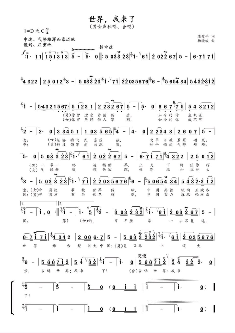 多年前,我和著名作曲家杨晓波老师合作的《世界,我来了》,感叹于中华民族大踏步地走向世界舞台的中央。今天看来,这已经不是目标,俨然成了现实。俄罗斯已经弱得只剩骨架,美国也从巨无霸滑向纸老虎。纵观世界,挑起人类命运共同体重任的,只有中国!堪当大任者,舍我其谁也!