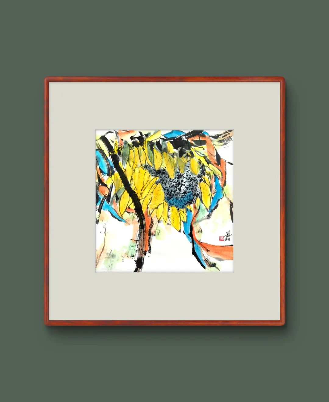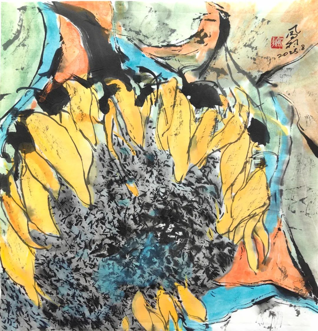 如果说牡丹是谷凤羽老师对传统题材的创造性转化,那么新近推出的写意向日葵,则是他艺术视野与时代精神碰撞的产物。在这批作品中,传统笔墨的根基依然清晰可见。