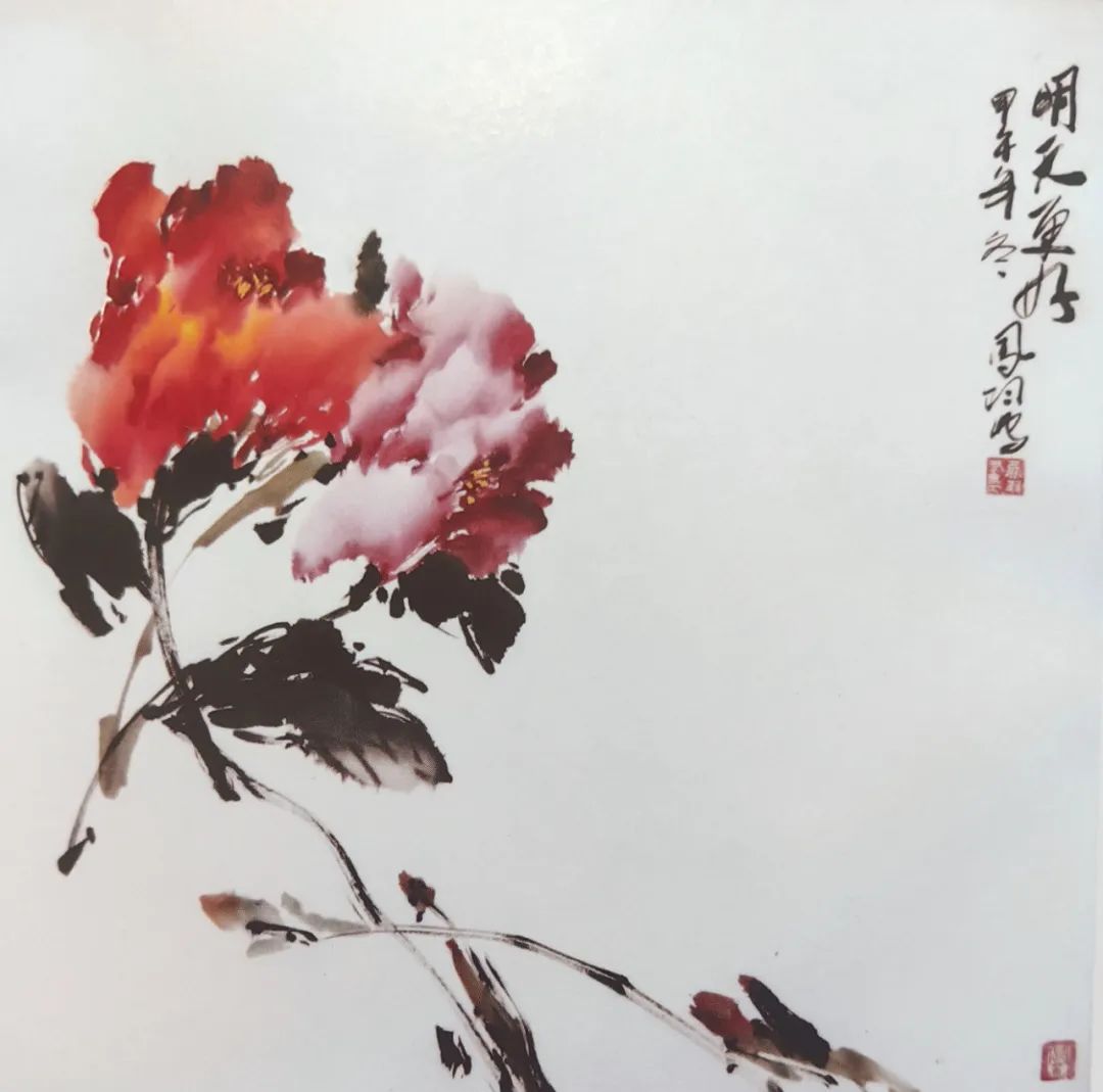 牡丹作为中国传统绘画中的经典题材,常被赋予富贵吉祥的寓意,但也容易陷入“甜俗”的窠臼。谷凤羽老师笔下的牡丹,却跳出了这一局限,将大写意的笔法与对生命本真的观察融为一体。他不刻意追求花瓣的精致描摹,而是以酣畅淋漓的笔墨趣味写尽牡丹如梦似真风姿绰约。《明天更好》,以含苞初放的花蕾,透着青涩的张力;《春酣》,则盛放如盘,尽显舒展的自信。墨与色的交融自然而不堆砌,艳红、嫩粉、雅黄在宣纸上晕染开来,既有“国色天香”的视觉冲击力,又因墨色的沉稳铺垫而显得含蓄内敛,所谓“艳而不俗”,正是这份色彩与笔墨的平衡之道。