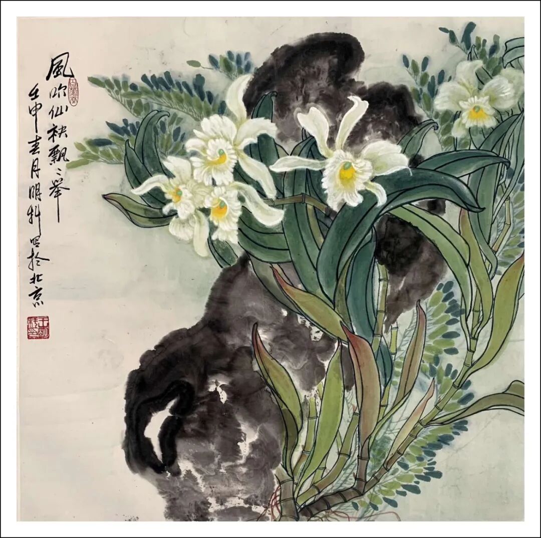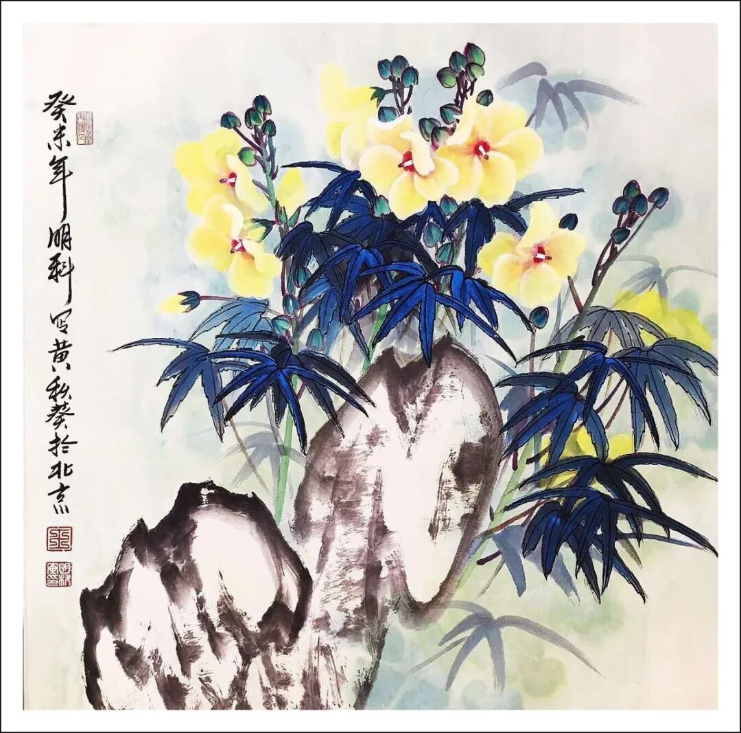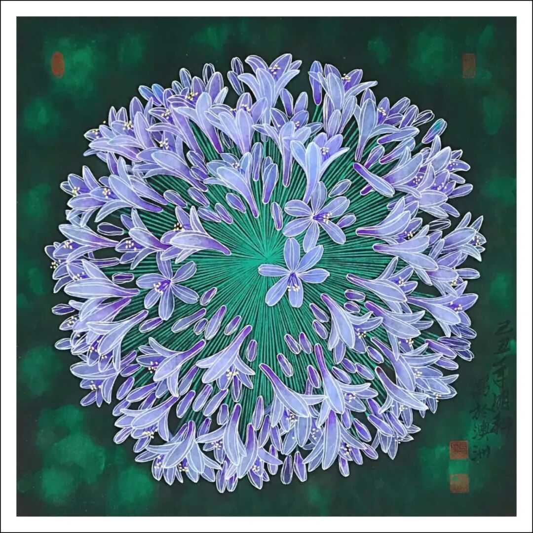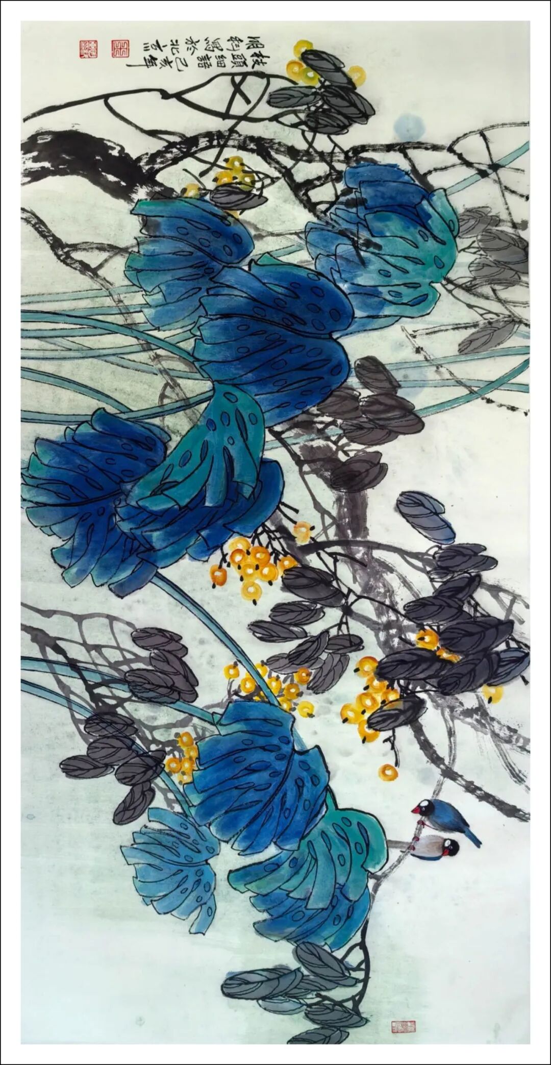 就比如说他的一幅《千禧之莲》,画中莲花首取盈动之姿,似绽放之初,含苞内敛。整朵莲花更是犹如油画那般,既追求于形质的真实厚重、也注重色调的准确渐变!但在画面背景中,王明科先生却是转用大写意的晕染效果,以深幽的蓝色作为主旋律,再融入少许的藻绿,使得整幅画面层次分明,渐次展开,与写实风格的莲花形成鲜明对比。最终在视觉上为观赏者带来一种循序渐进的空间纵深!可以说,无论是色彩语言,亦或是视觉审美,这些艺术手段都是为了实现王明科先生的创作初衷,那就是唤起观赏者内心深处的艺术共鸣,遂之激发无限联想……