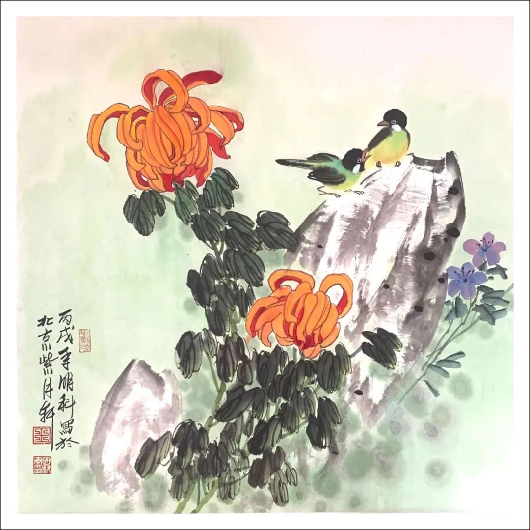 菊花小鸟 生宣工写彩墨 68x68cm 2006年 王明科