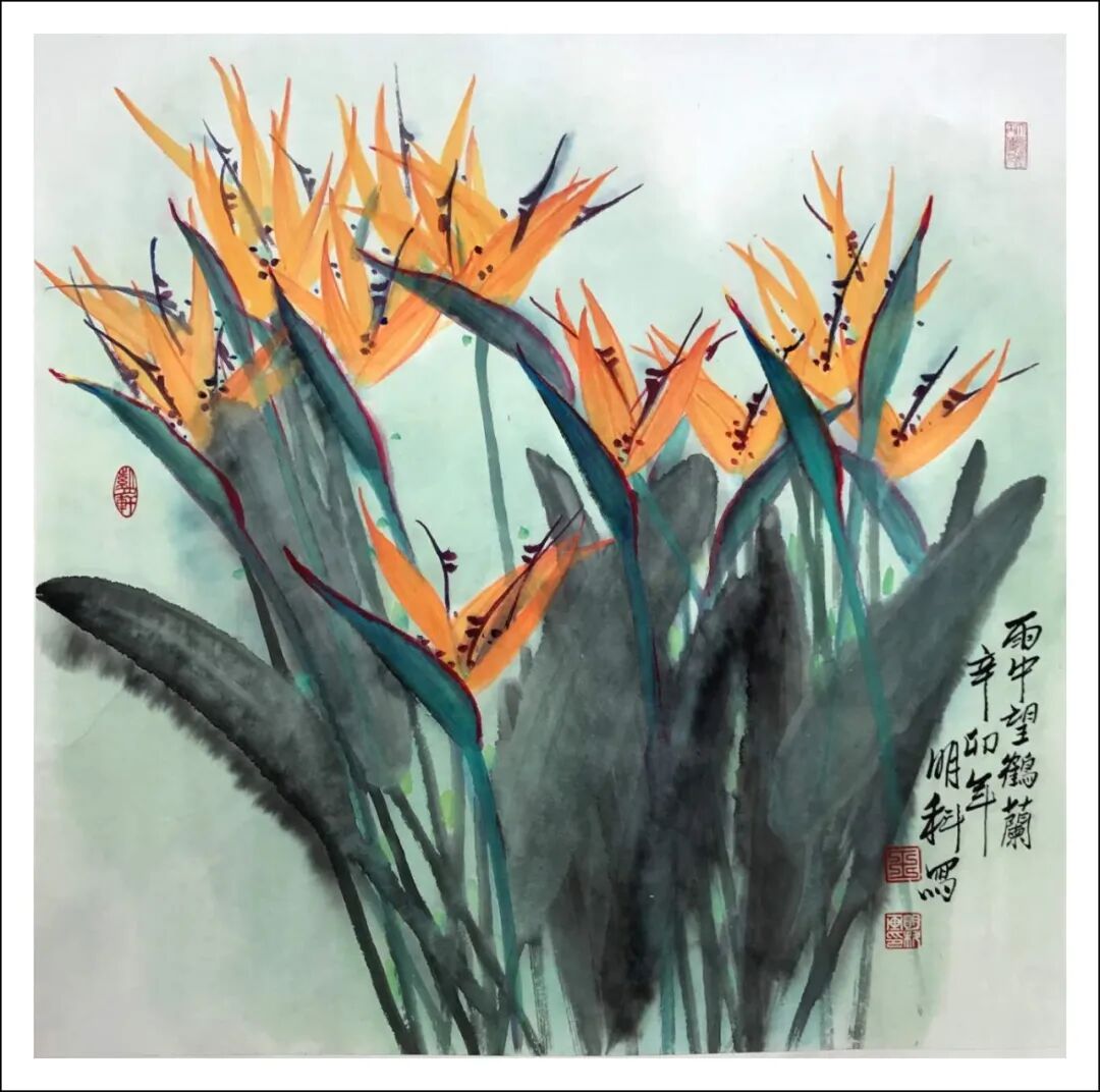 雨中鹤望兰 生宣彩墨 68x68cm 2011年 王明科