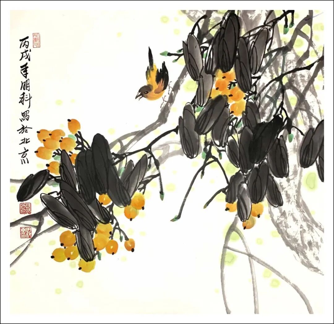 枇杷小鳥 生宣彩墨 68X68㎝ 2006年 王明科