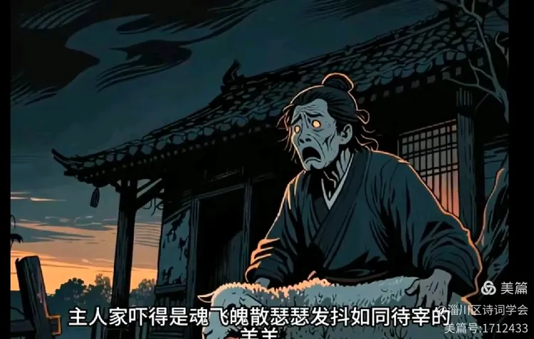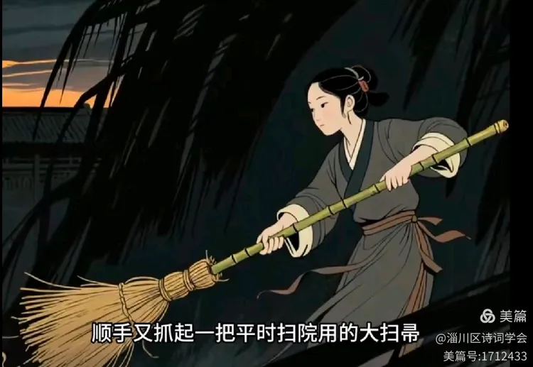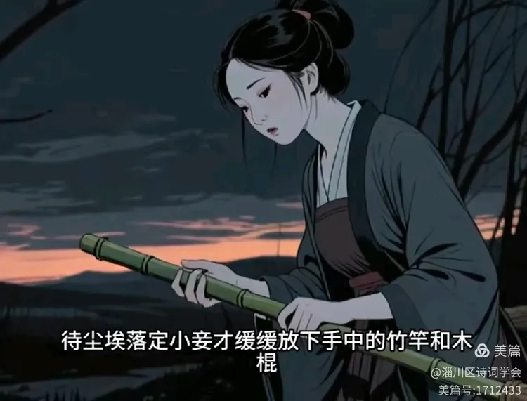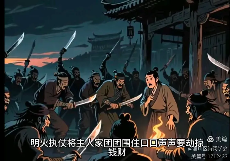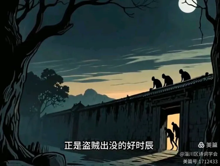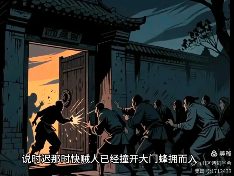 月光辉,夜来贼,主与妻、魄散魂飞。妾杖追贼抽栓曳,技舞钩鸣盗贼退,贼人溃败啼。