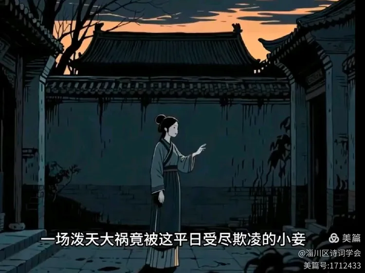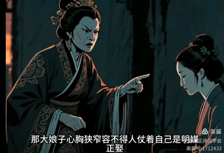 为妾温柔侍主公,受凌忍性自从容。身怀绝技成心隐,家遇侵伤竭力攻。 功颇大,意谦恭,仍持妇道不争风。明言旧礼称贤德,暗讽屈从行不通。