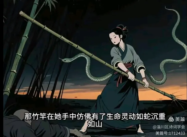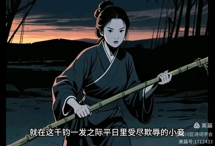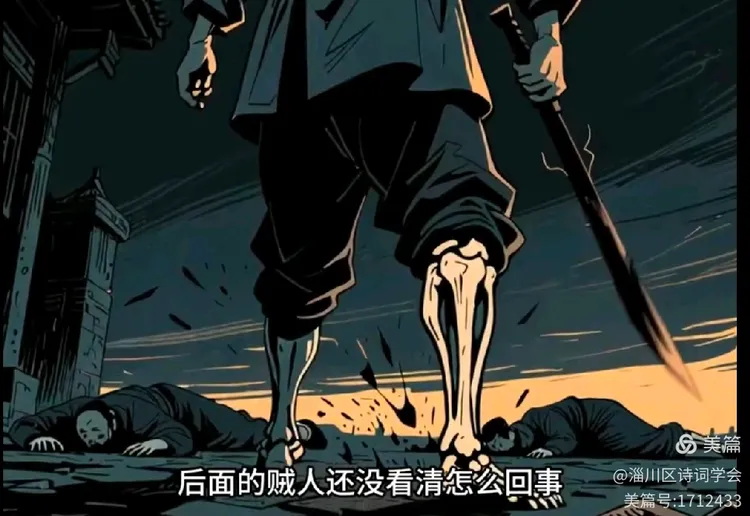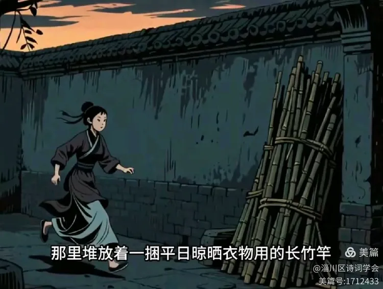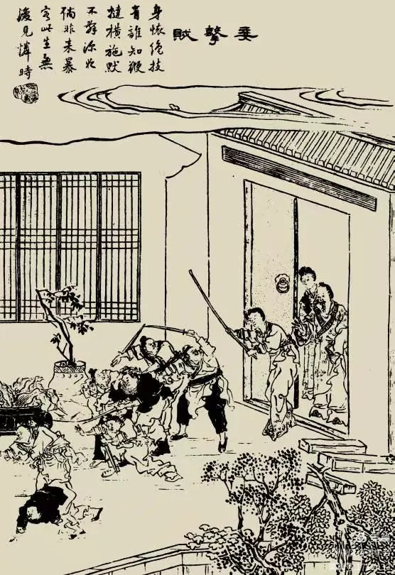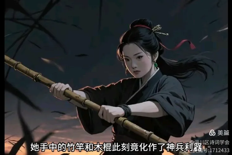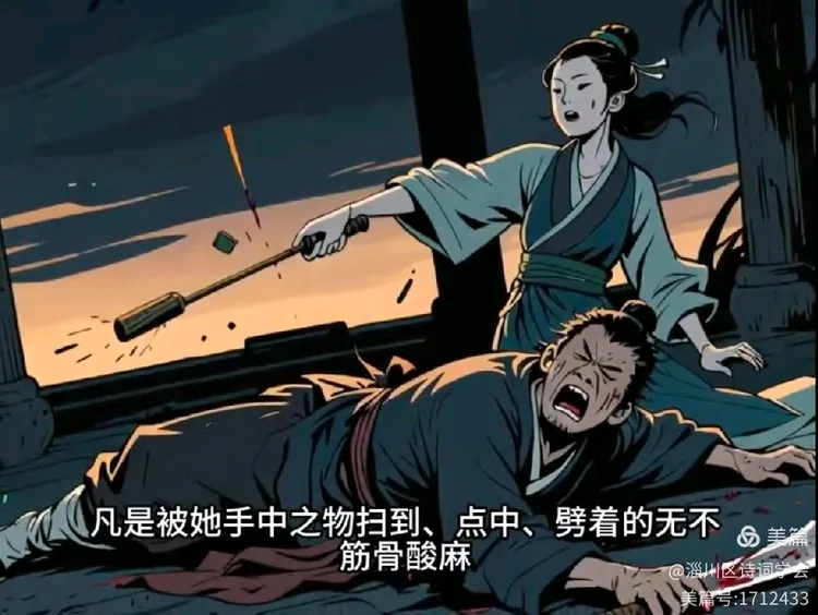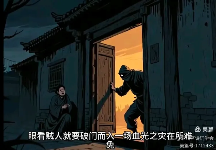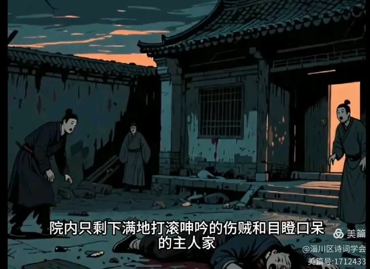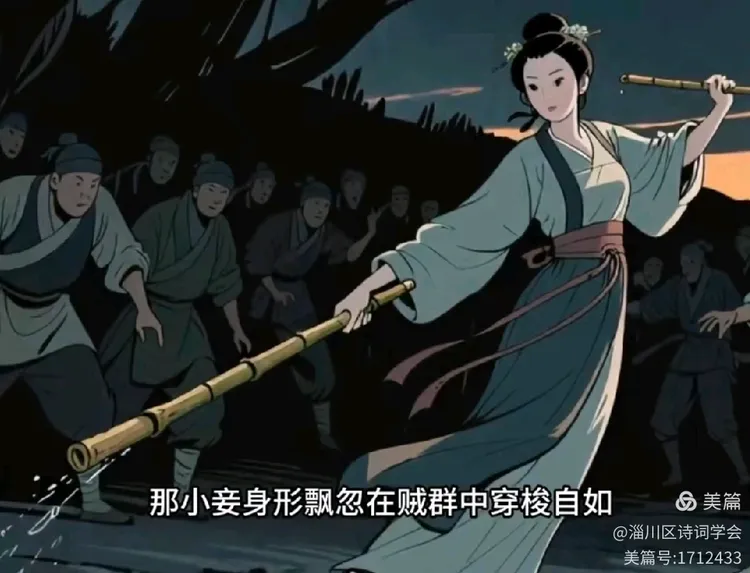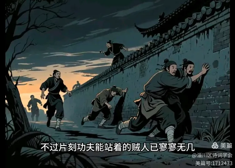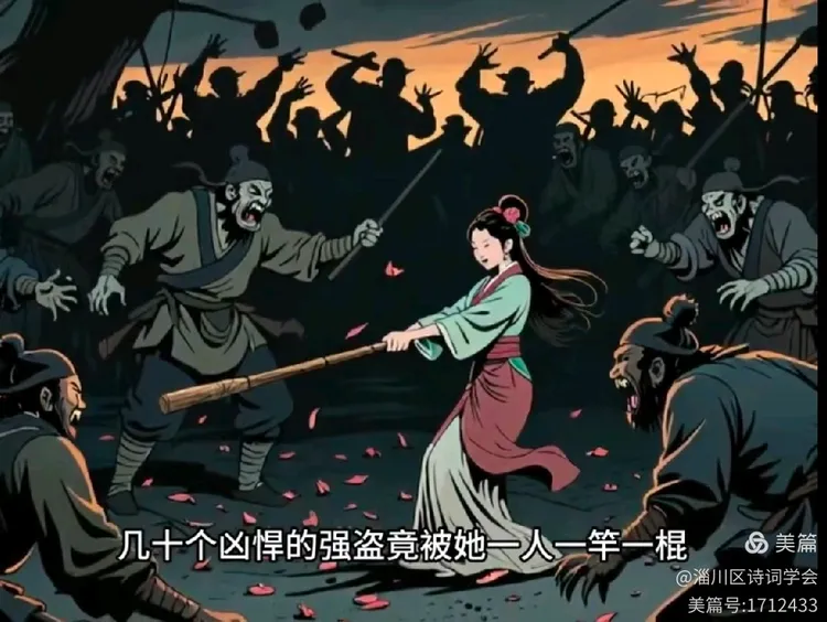 夜阑风烈,扉门欲裂,主仆魂散浑无策。妾轻捷,杖横截,风声乍起贼人愕,笑骂凶徒如雀跌。惊,他战瘸;奇,她技绝。
