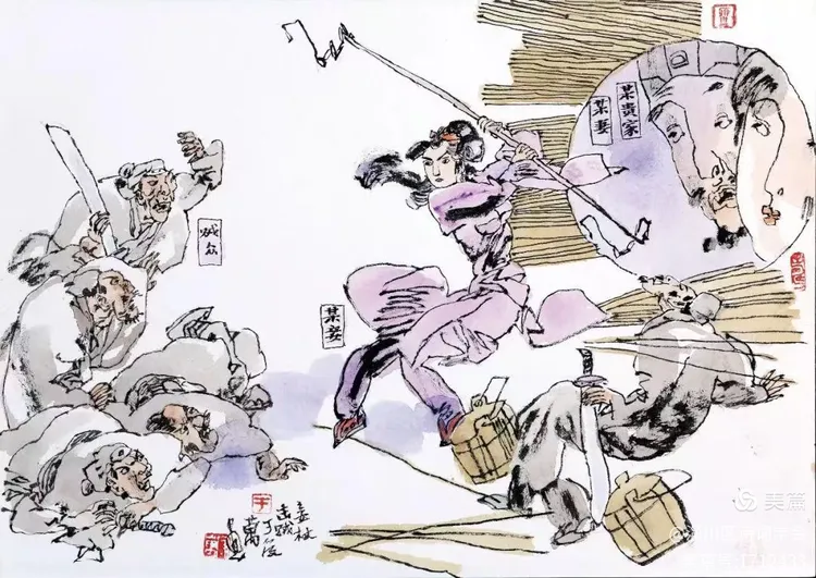 妾起,默无声息,暗摸屋中,得挑水木杖一,拔关遽出。群贼乱如蓬麻。妾舞杖动,风鸣钩响,击四五人仆地;贼尽靡,骇愕乱奔墙,急不得上,倾跌咿哑,亡魂失命。