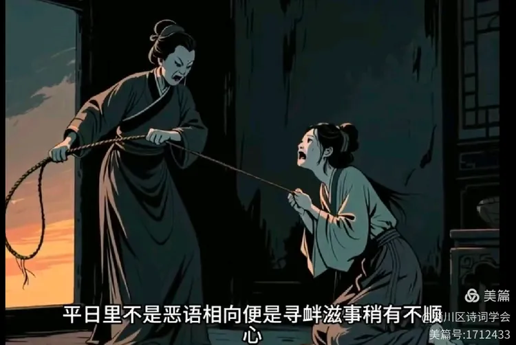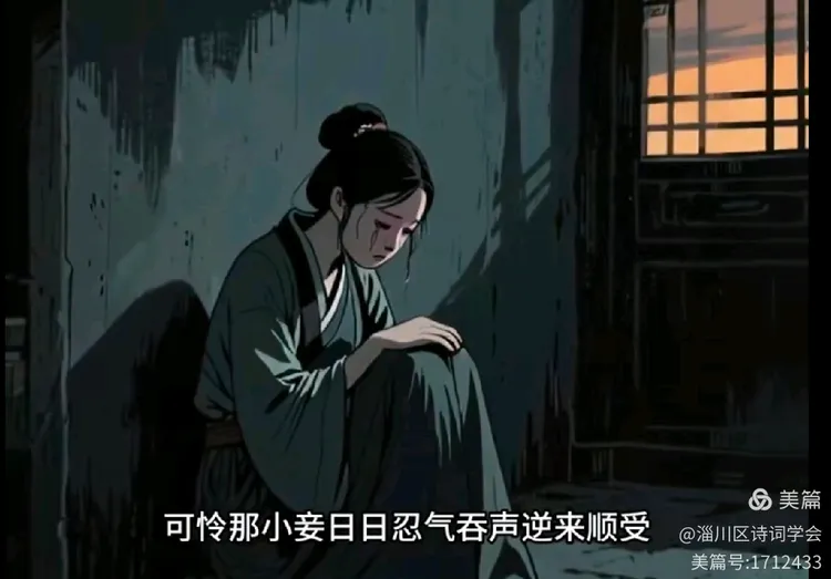 对淫威,面无悲,奈若何、主妾分尊卑。任尔谦恭多贤惠,任尔无争也无罪,无端棍棒挥。