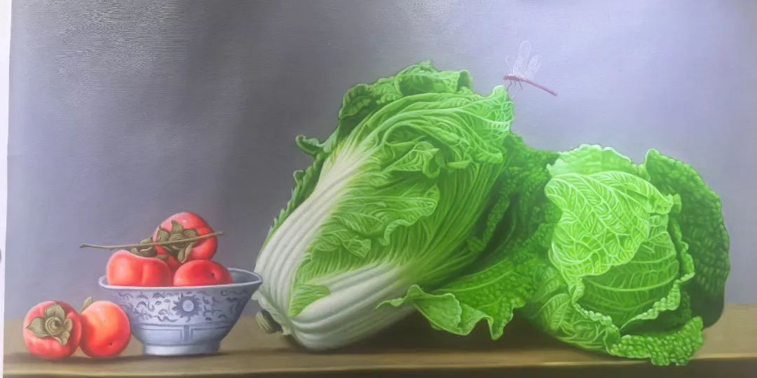 贺天飞的葡萄作品色彩丰富,有深紫、红、浅绿等色调,色彩过渡自然, 体现出葡萄成熟时的饱满与诱人。
