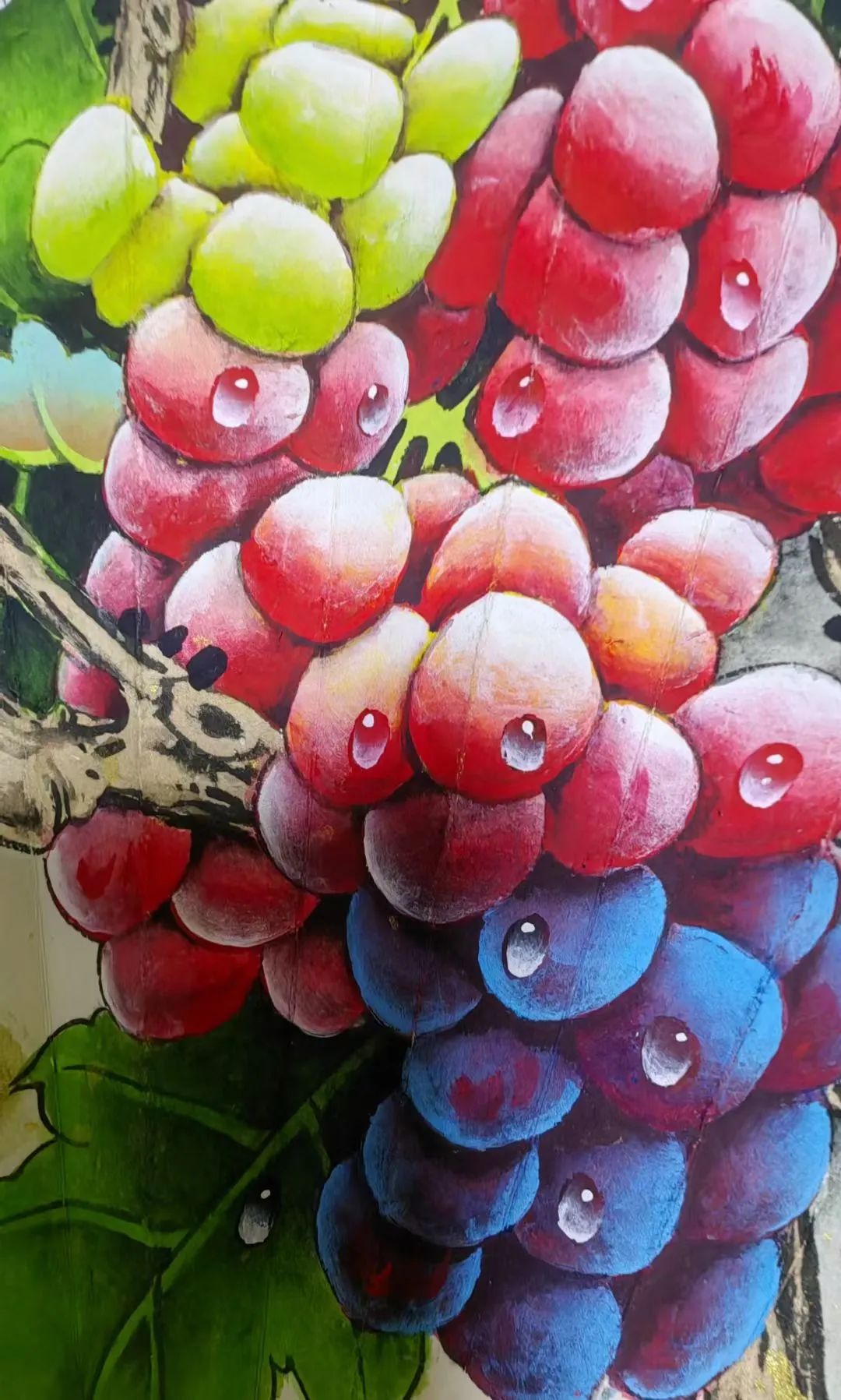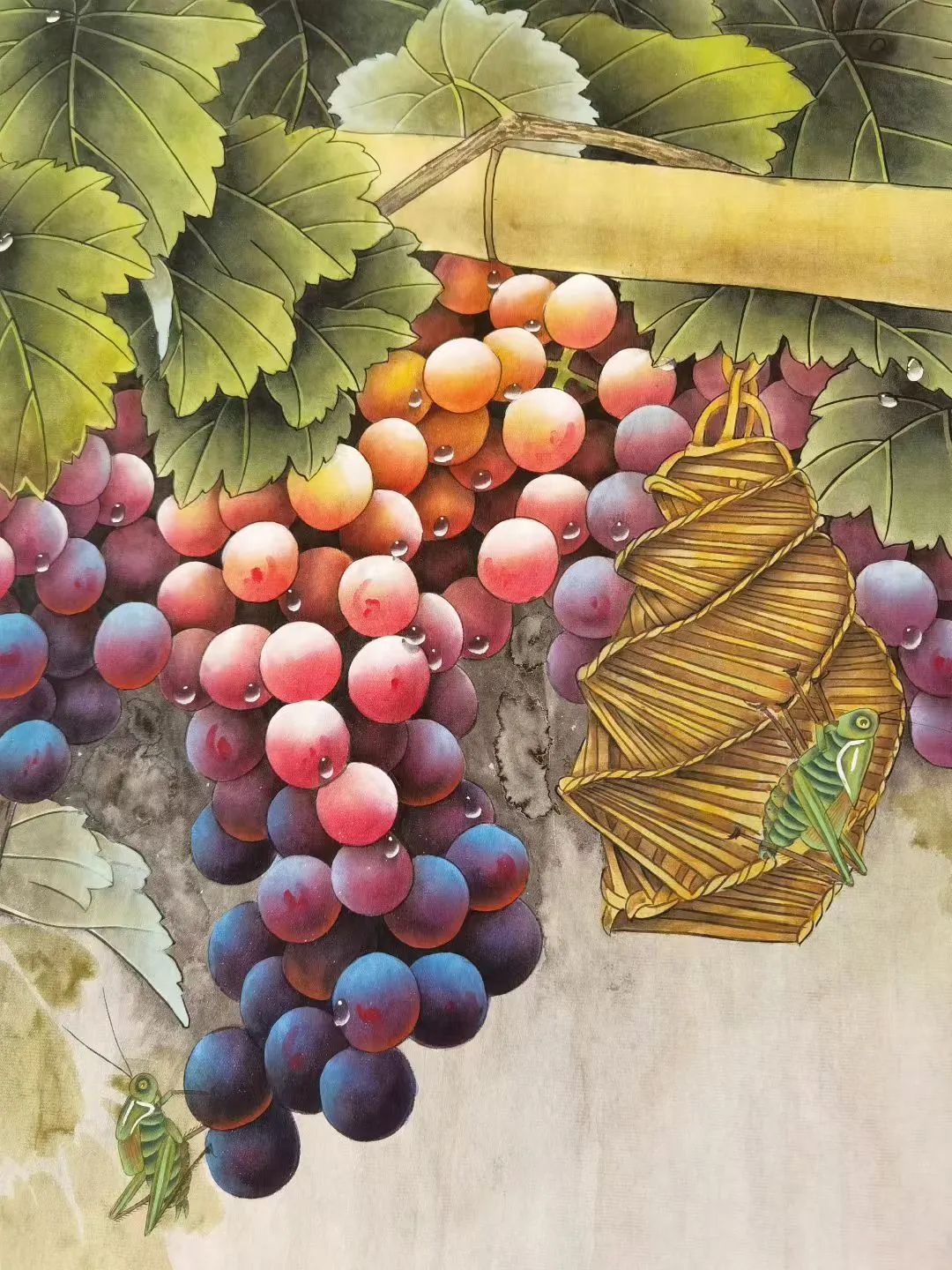 画家对葡萄果实和叶子的细节刻画入微。葡萄表面的水珠晶莹剔透,增加了画面的生动性和真实感;葡萄叶子的脉络清晰可见, 凸显了叶子的生机与质感,画中对叶子脉络的描绘,体现了画家扎实的写实功底。