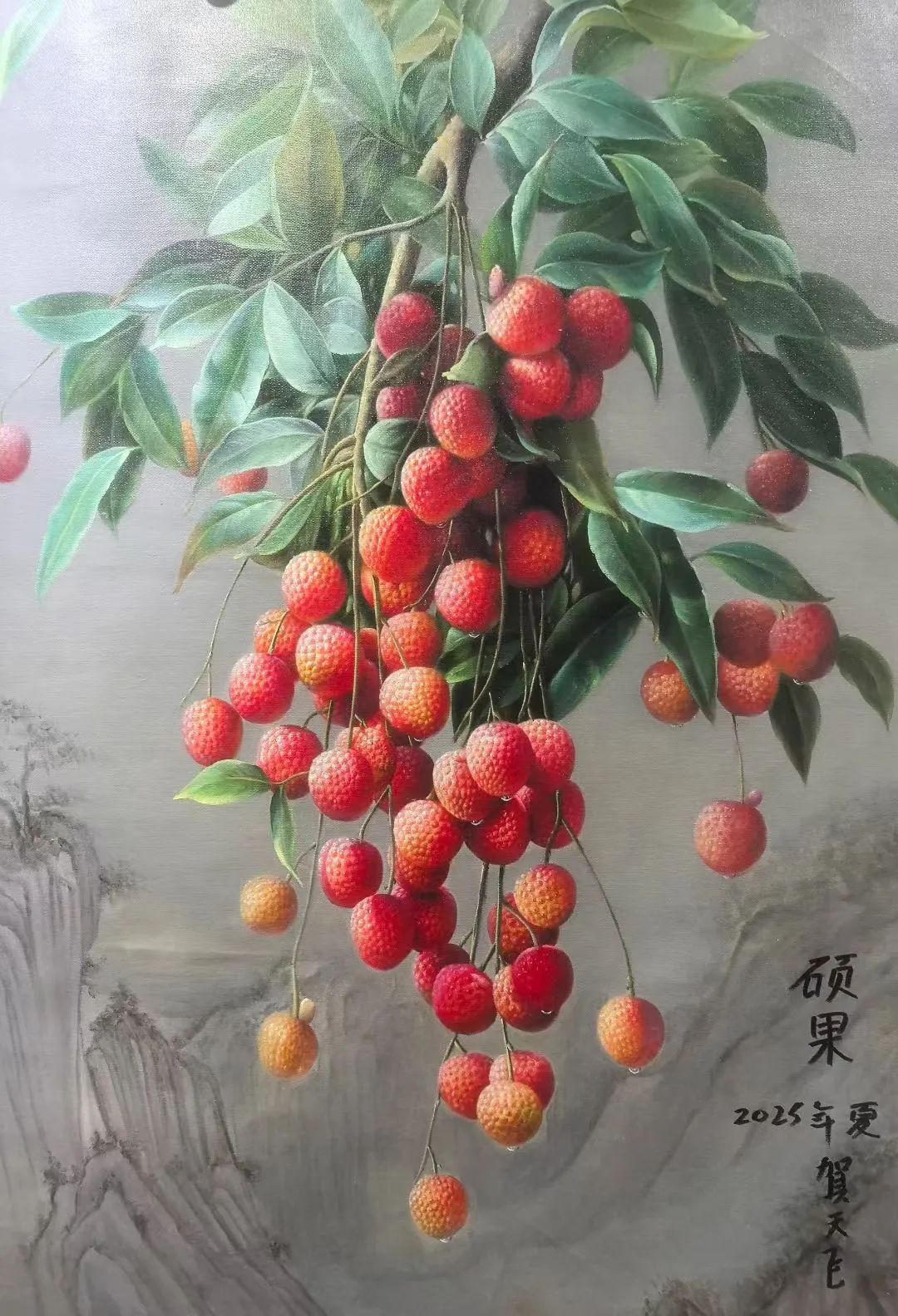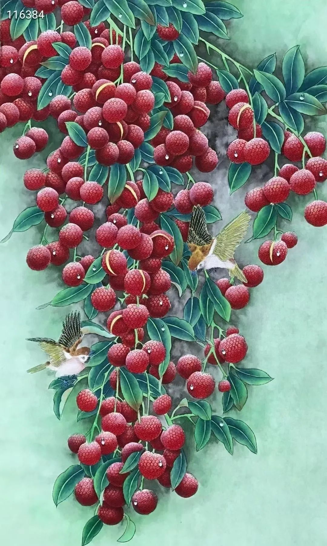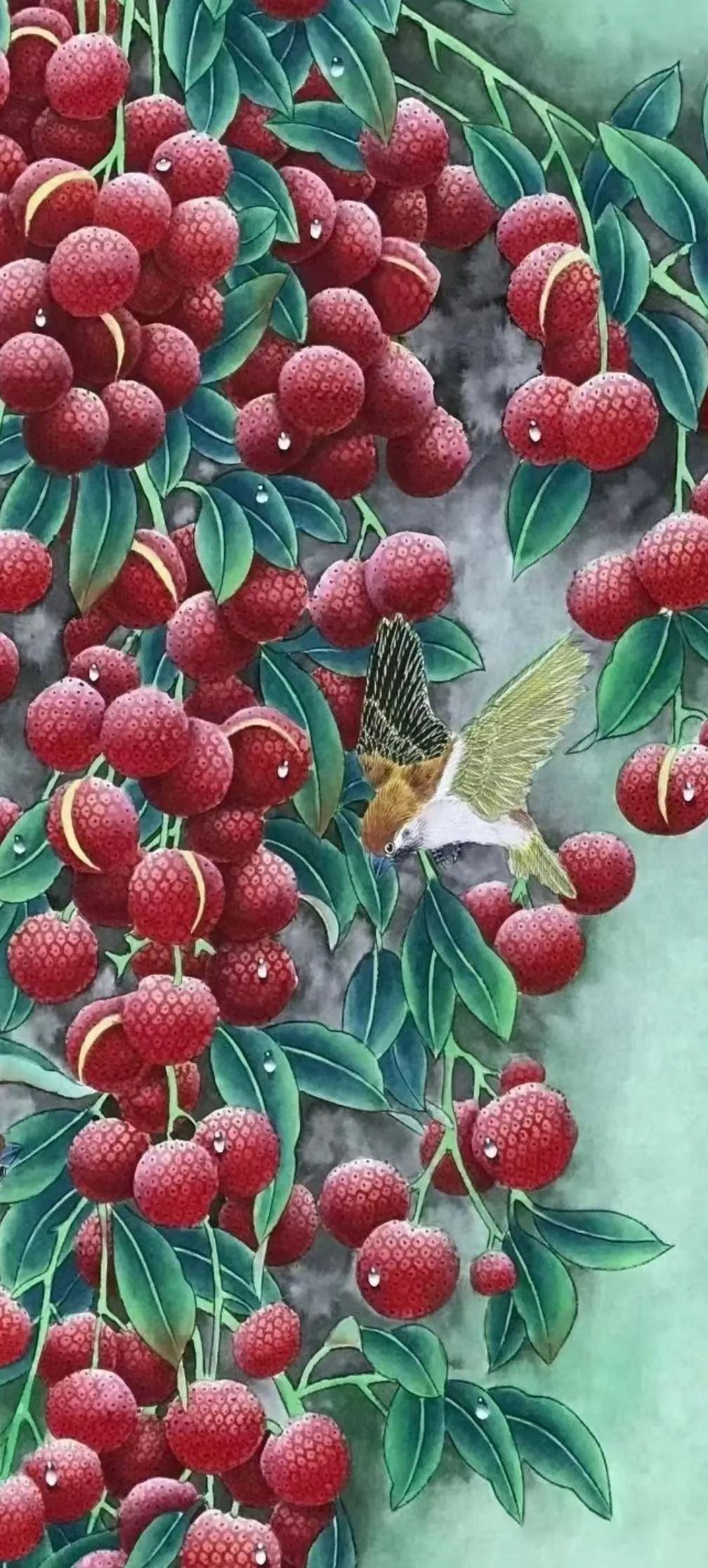 鸟的灵动点缀:小鸟展翅、栖枝的姿态,打破荔枝成串的静态密集感,增添画面呼吸感;羽毛的丝缕描绘与荔枝的厚重形成“动与静”“轻与重”的对比。