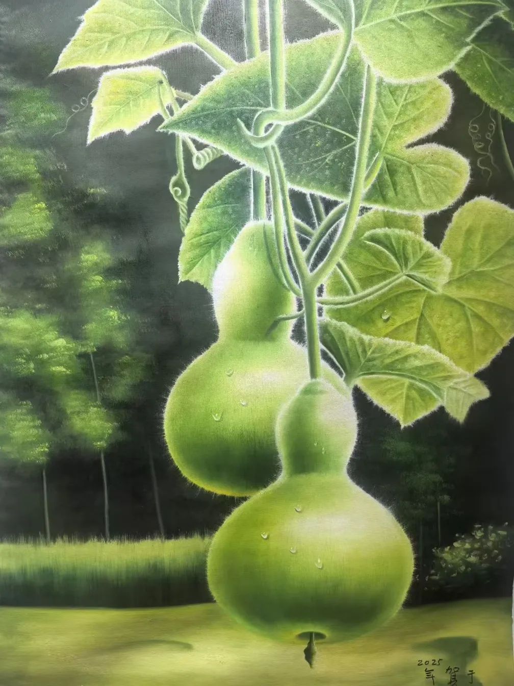 画家贺天飞对葫芦的质感刻画精准,绿色葫芦表面的细毛清晰可辨,水珠晶莹剔透,仿佛能感受到清晨的露水,凸显出葫芦的鲜活与生机。叶片的脉络、藤蔓的卷曲也细致入微,体现出扎实的写实功底。