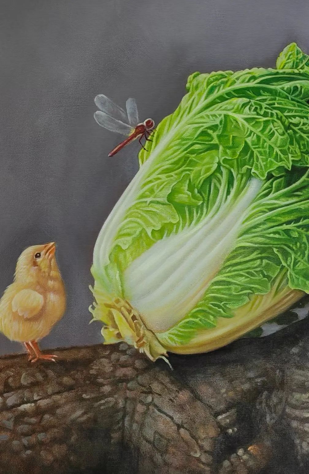 小鸡的新生、蜻蜓的灵动、白菜的丰茂,共同构成“生命链条”——从战争废墟中复苏,到和平年代的蓬勃生长,隐喻国家在80年和平岁月中“从荒芜到繁荣”的史诗轨迹。
