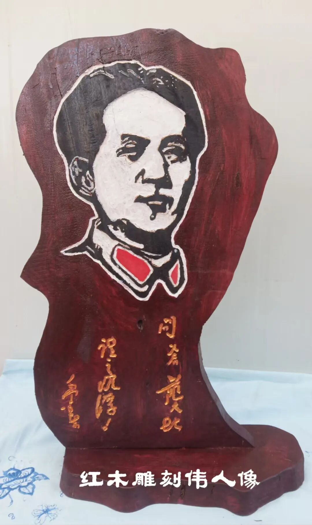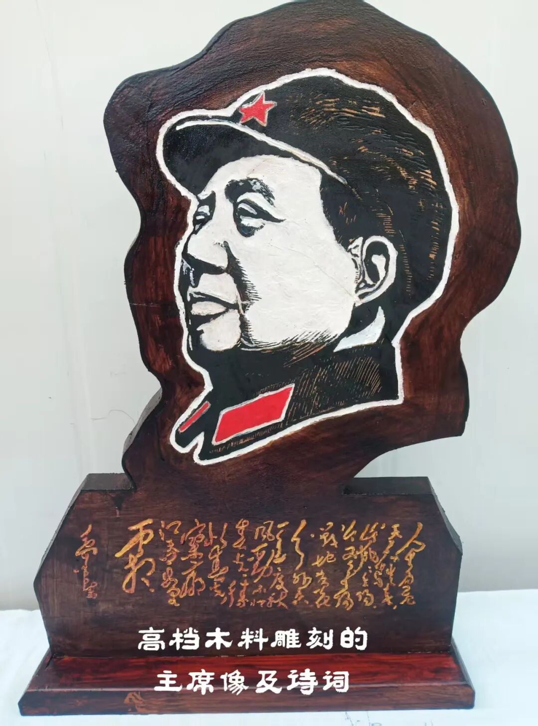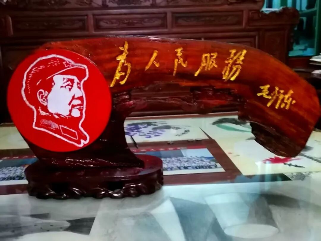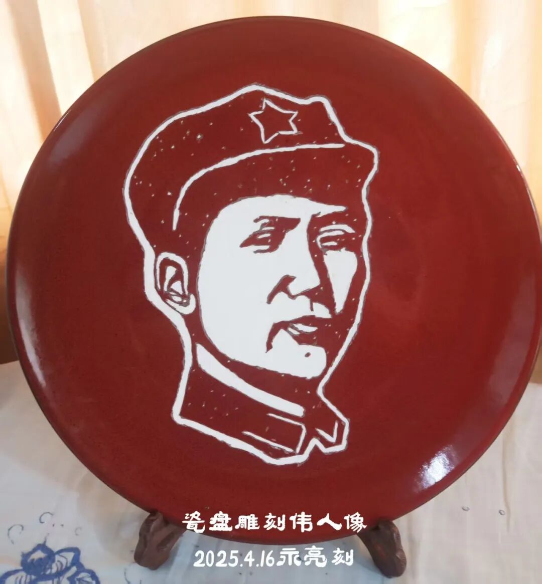 本人书法完美应合了红色题材,并将伟人形象和经典语录皆雕刻于其中,用木雕创作出“伟人头像加精典语录”用瓷盘雕刻毛主席各种头像。这种以刀代笔,诗与书相结合,书又能与时代相映照,正如艺界常言:“笔墨当随时代”。