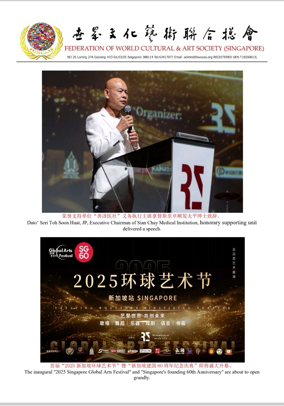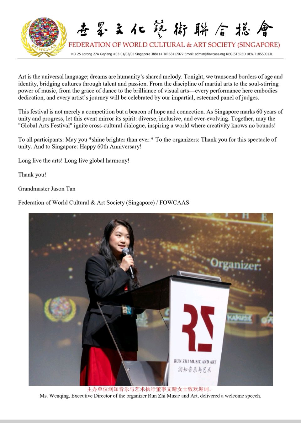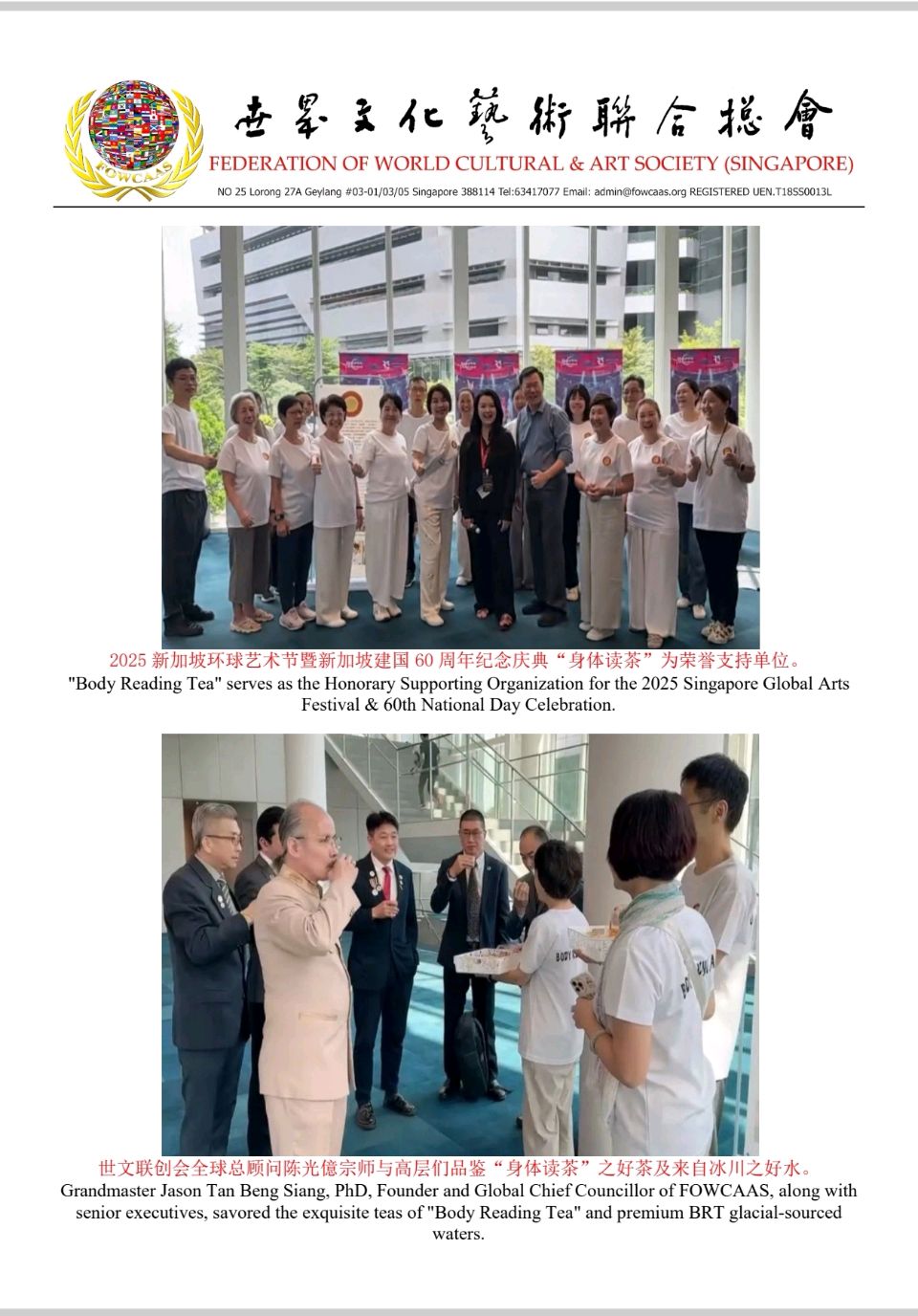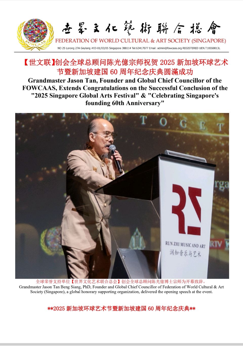 Grandmaster Jason Tan, Founder and Global Chief Councillor of the FOWCAAS, Extends Congratulations on the Successful Conclusion of the "2025 Singapore Global Arts Festival" & "Celebrating Singapore's founding 60th Anniversary"