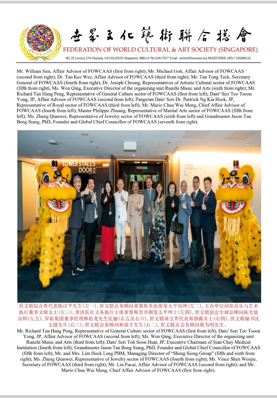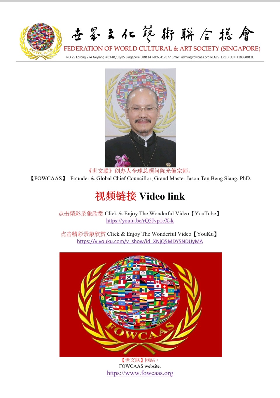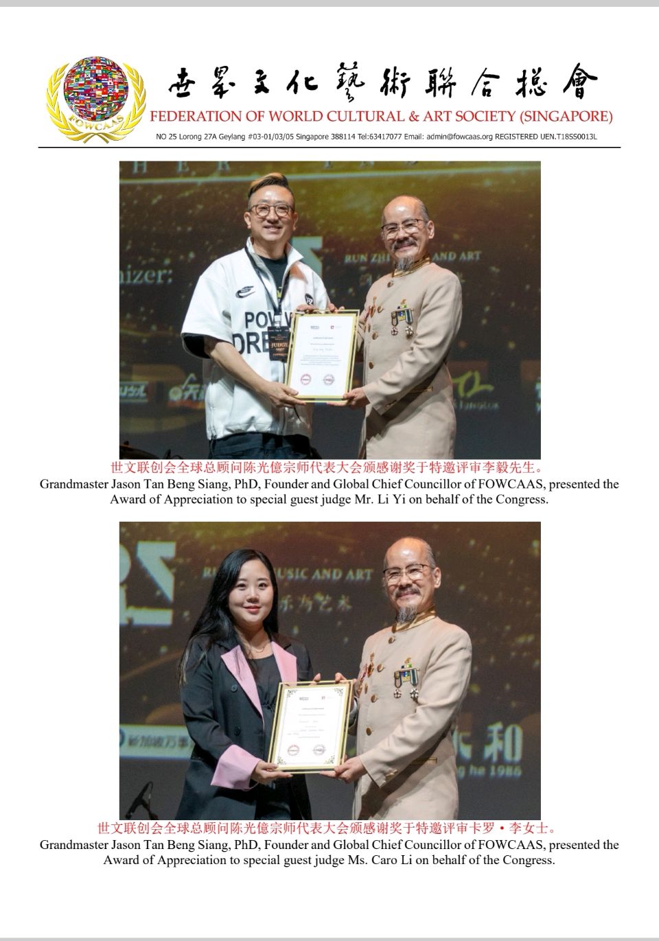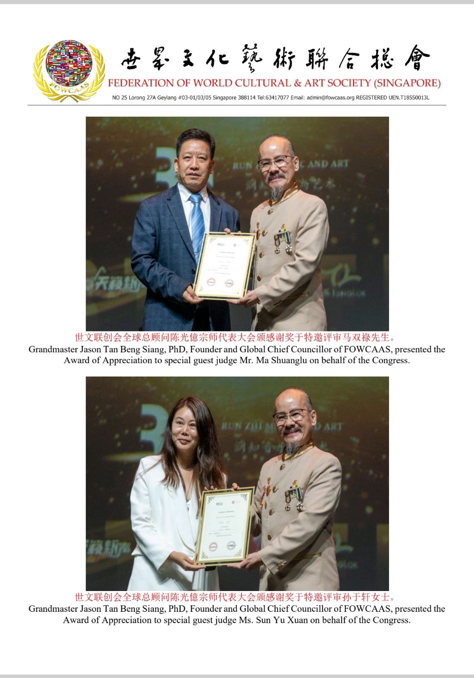 Grandmaster Jason Tan, Founder and Global Chief Councillor of the FOWCAAS, Extends Congratulations on the Successful Conclusion of the "2025 Singapore Global Arts Festival" & "Celebrating Singapore's founding 60th Anniversary"