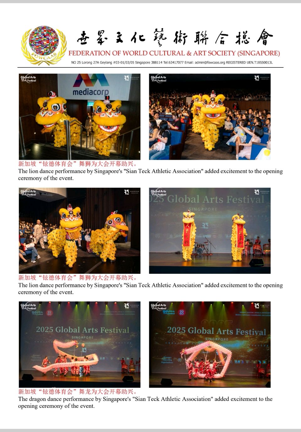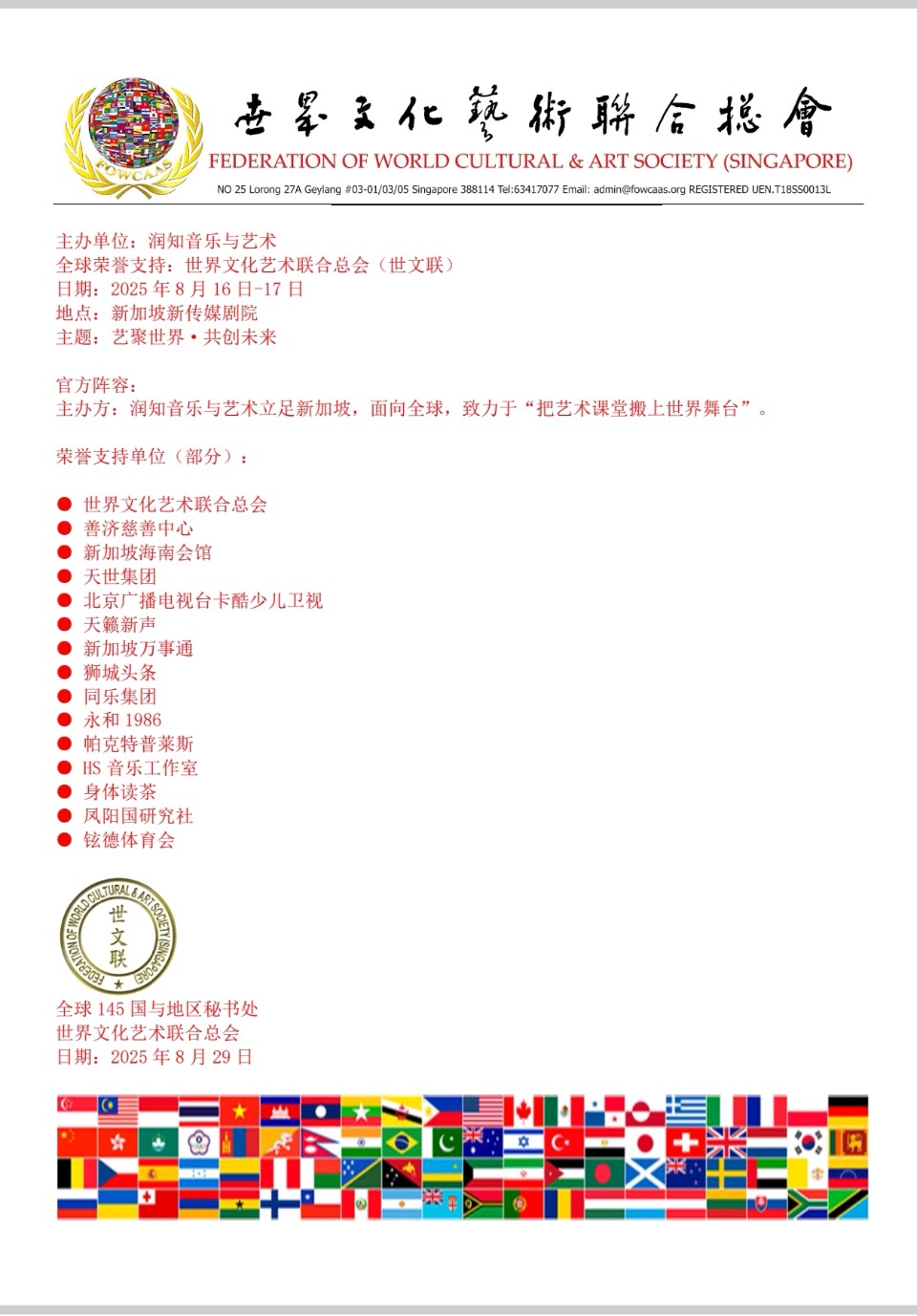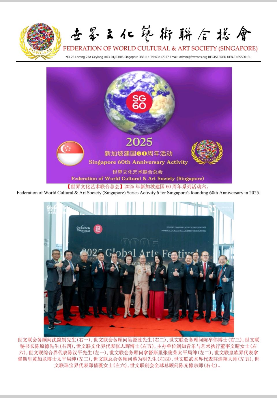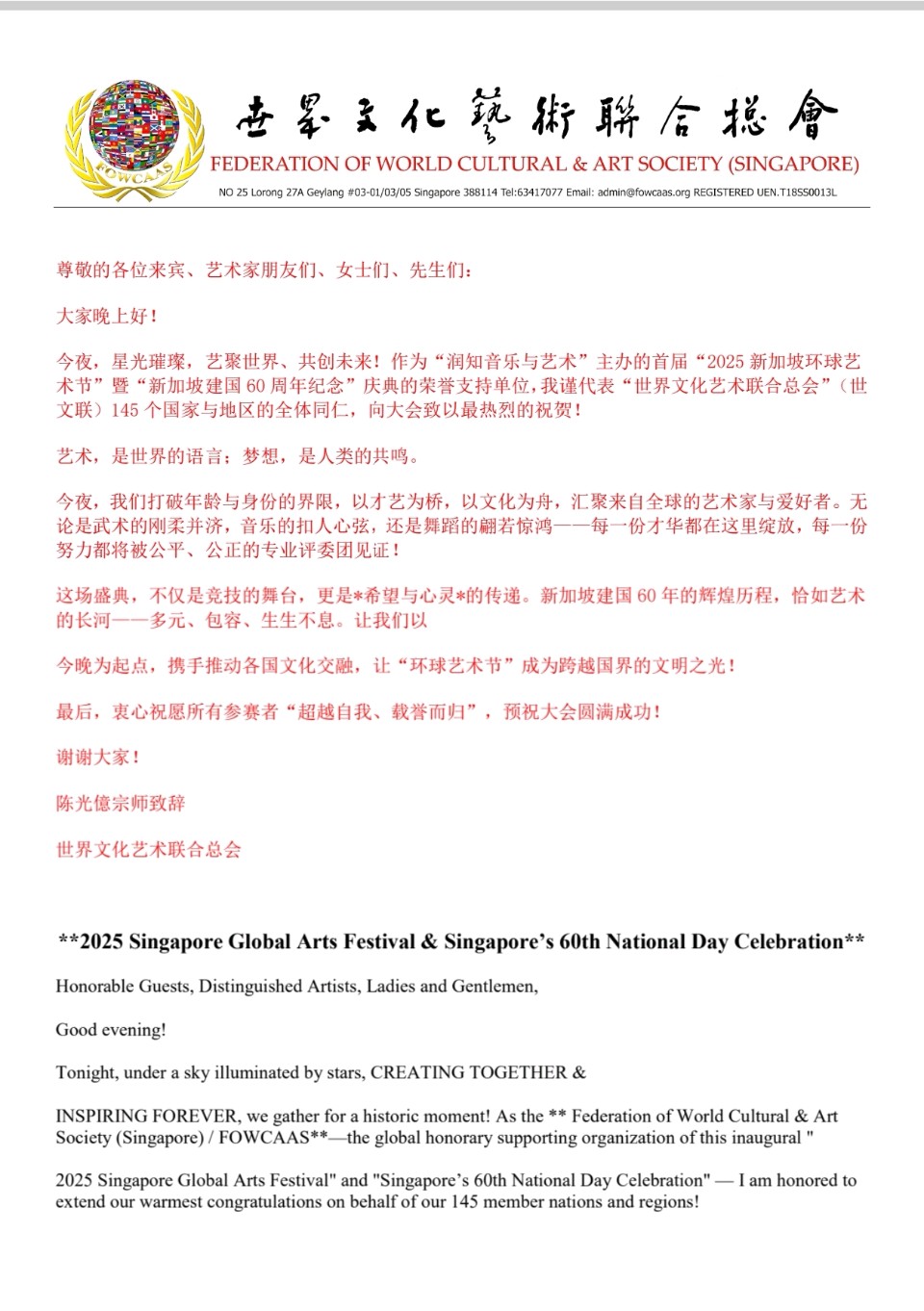 【世文联】创会全球总顾问陈光億宗师祝贺2025新加坡环球艺术节暨新加坡建国60周年纪念庆典圆滿成功