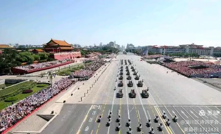 亮剑首都中轴线,三军气宇轩昂。铁流滚滚世无双。不忘历史,弱国必图强。 一十三年持久战,驱魔打鬼东洋。抛头洒血著辉煌。悲歌一曲,铭记在心房。