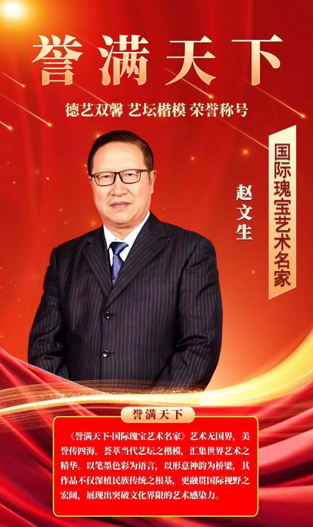 先后获得“世界和平艺术贡献者”奖。获西班牙皇家艺术协会、毕加索故宫博物院、巴塞罗那艺术学院联合颁发的“优秀导师”奖。获国际金牌艺术家及中国艺术首届金马奖。艺术中的诺贝尔奖获得者。“金砖艺术家”。全国“五个一工程奖”。“孔子奖章艺术顾问”。被人民日报授予“新时代书画艺术先锋人物”。草书得到范曾、薛永年教授极高的评价。先后有多本教材、专集,合集在全国发行。多次走进央视并登上笔尖下的中国栏目。作品分别在北京机场候机厅,高铁站,首都地铁展播,影响国内外。被授予当代最具收藏和艺术价值的书画家。先后被中宣部授予“时代楷模——笔尖下的中国赵文生”;被文联授予“全国艺术劳动模范”称号。被文旅部授予“共和国艺术楷模”荣誉。被中书协,中美协等授予“人民书画家”称号。同年被央广国际文化交流艺委会授予“中华文化品牌′人物”。2023年”文化中国传播大使”特别授予<意草书法创始人>。长卷《岳阳楼记》被专家评审团授予国宝并被国宝档案存档。2024年受邀中国教育电视台录制“欢乐中国年”节目。2025年国宝长卷<岳阳楼记>等二幅作品被推介到阿拉伯国家。被中视文化产业聘为“书法评论家”。