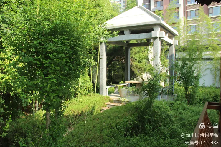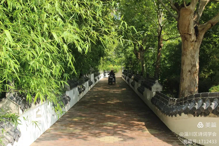 竹园小径通幽处,轩榭亭台映碧塘。