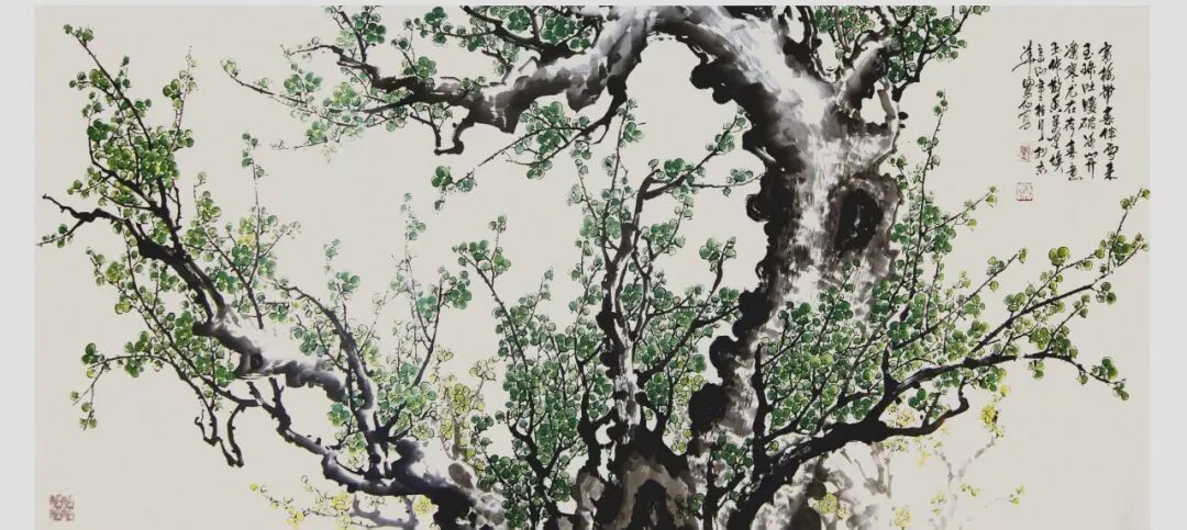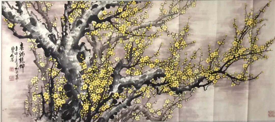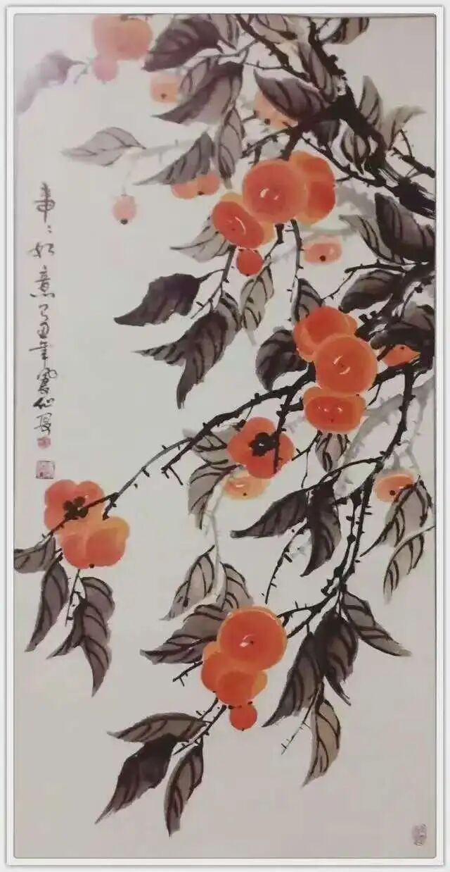 绘画作品中的诗文跋语往往代表作品主人的心声。一句好诗,能表现出作者的内涵和学养。一句好诗,亦能起到画龙点睛的作用。刘凤仙作品中的诗句布局巧妙,胸怀天地,在构图上,突出主体,讲求布局中的虚实对比与顾盼呼应,把发挥画意的诗歌题句,用与画风相协调的书法在适当的位置书写出来,辅以印章,成为一种以画为主的综合性书画艺术作品,留白空间的疏、密、聚、散;花、果、鸟、叶的柔嫩灵活,老干边缘的毛、涩质感,无不显示其作品的巧夺天工。