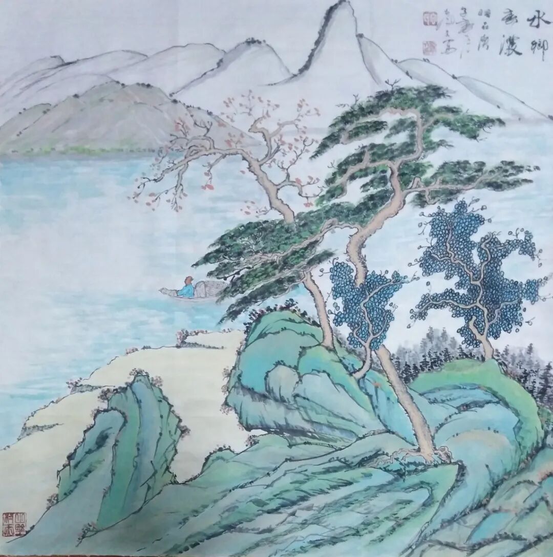 作山水笔运石青浅绿,墨色滋润,色不碍墨,墨不碍化,淡赭和青绿碰在一起,画里就有藤黄水侵入墨笔,自然润色无限好的精气神。他的山水无艳,无烟火气,画里画外都是苍润的味儿,挂在家居立即蓬荜生辉,最是雅俗共赏的优品!