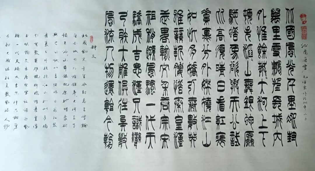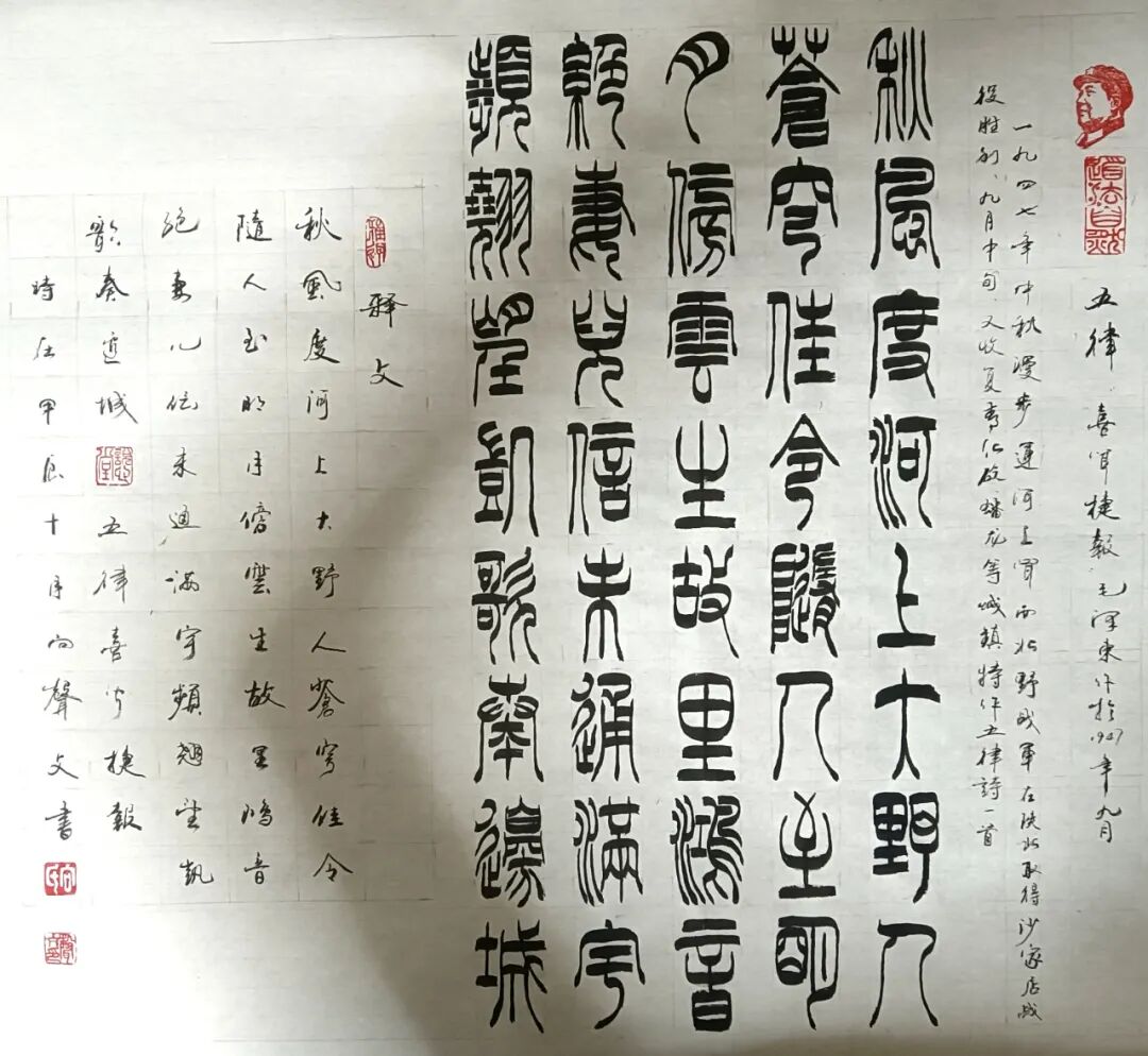 欣赏先生的行草作品,流畅中见骨力,飞扬处守法度。其线条如行云流水,节奏分明,气韵贯通全篇。观其行草,既具迅疾之势,又含沉静之态。字与字之间呼应顾盼,行与行之间疏密有致,整体章法和谐富于变化,展现出深厚的传统功底与鲜明的个人风格。向先生在篆书领域用功尤深,其篆书结体严谨而不失生动,笔力雄健而韵味悠长。先生近年来以篆书写毛主席诗词119首,历时两年有余,这一宏大的艺术工程既是对传统书法的深度传承,更是对红色文化的当代诠释。在这一笔一划间,我们看到的不仅是一位艺术家的技艺展现,更是一位文化守望者的使命担当。