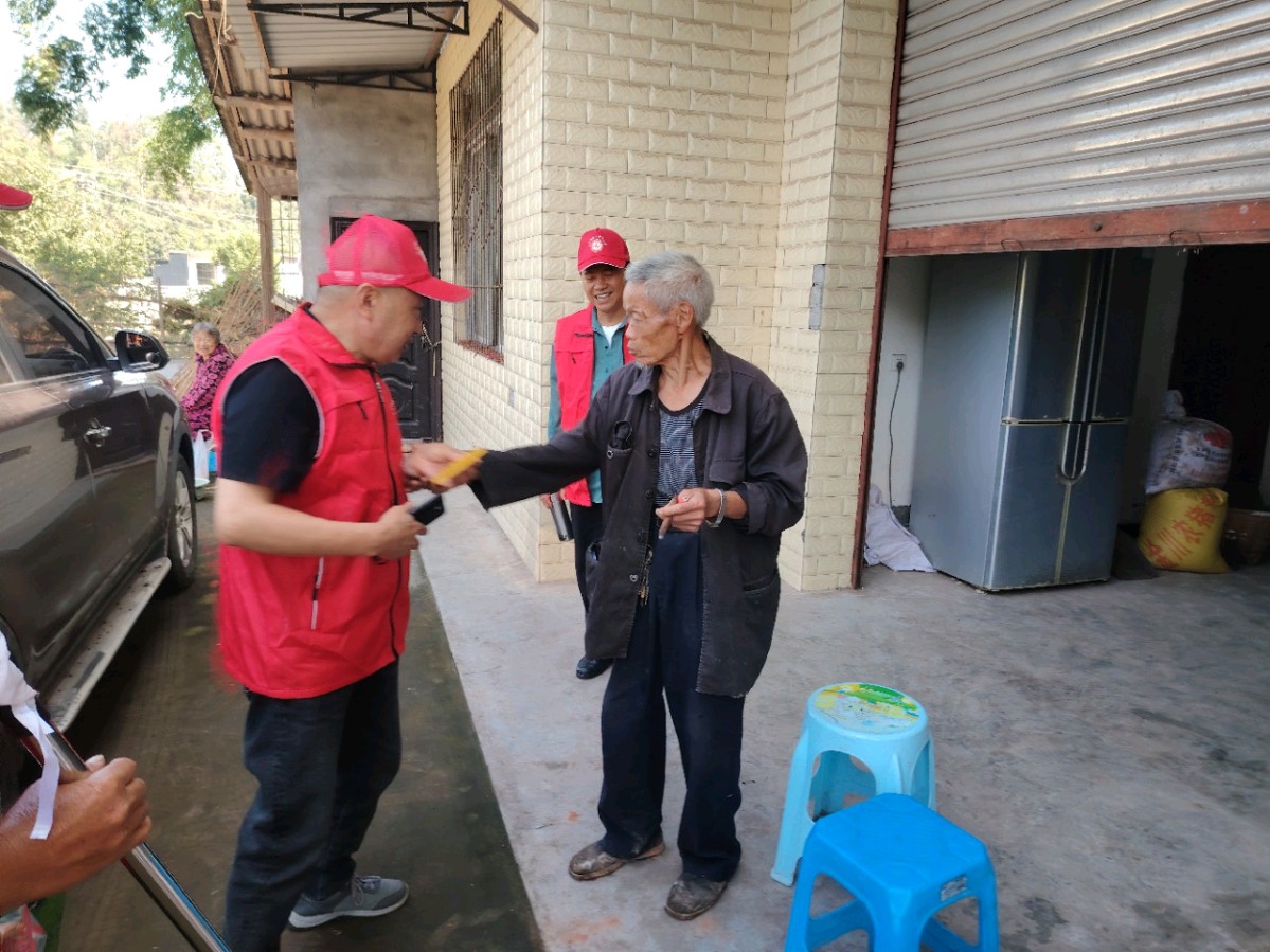 9月24日这天,白果银龄志愿服务队5名队员,乘坐队员唐小虎同志私家车驶过蜿蜒的乡村公路,车轮碾过带着露水的路面,溅起细碎的光斑。车后座堆放着两份沉甸甸的礼品:中秋月饼、牛奶等,这些带着温度的慰问品,是乡机关支部书记李建全和乡老协主席卢泽军前一天特意去县城采购的。"王大爷的眼睛不好,得给他带副轻便的老花镜;罗大叔爱听收音机,新电池记得捎上。"卢泽军一边清点物品一边念叨,副驾驶座上的陈安明是老民政办主任,目光望向窗外掠过的椪柑园和白墙黛瓦,轻声说:“这些老党员年轻时为乡村建设熬白了头,现在该我们为他们遮风挡雨了。”