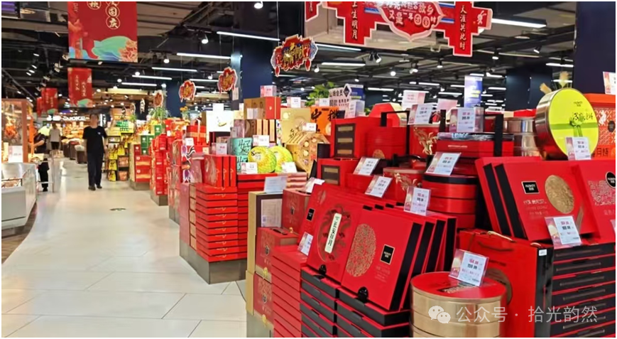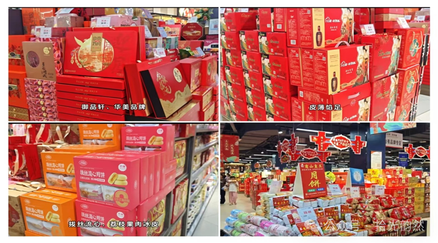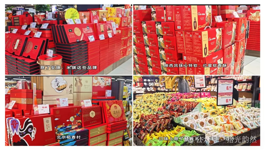 走进超市,浓郁的中秋氛围瞬间将人包围。红色主题装饰点缀每个角落,“喜迎中秋 欢度国庆”的字样洋溢着双节同庆的喜悦。而其中最引人注目的,莫过于全新打造的月饼专区——这里不仅是各大品牌月饼展示风采的舞台,更是无数家庭团圆心意的汇聚之地。