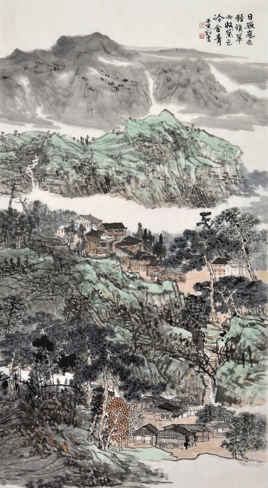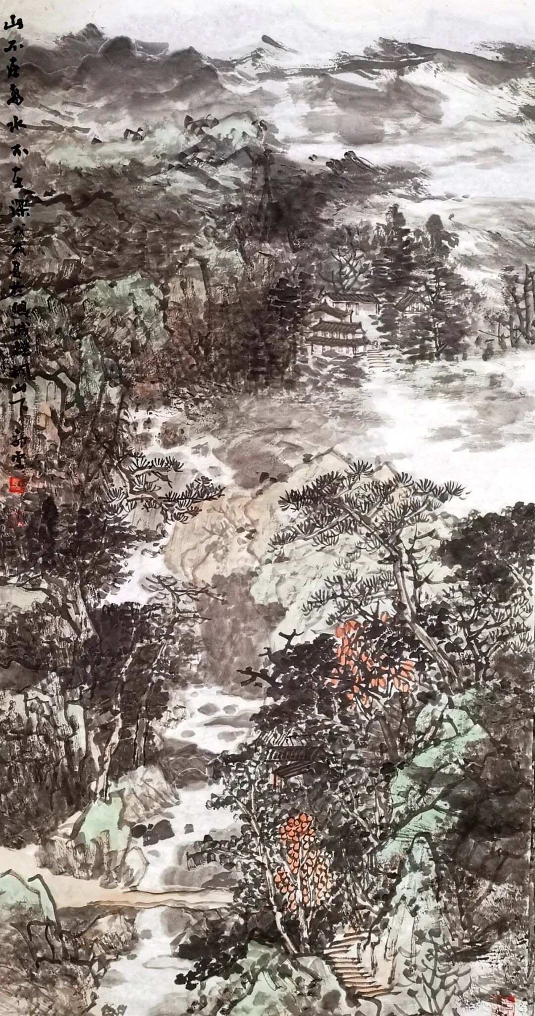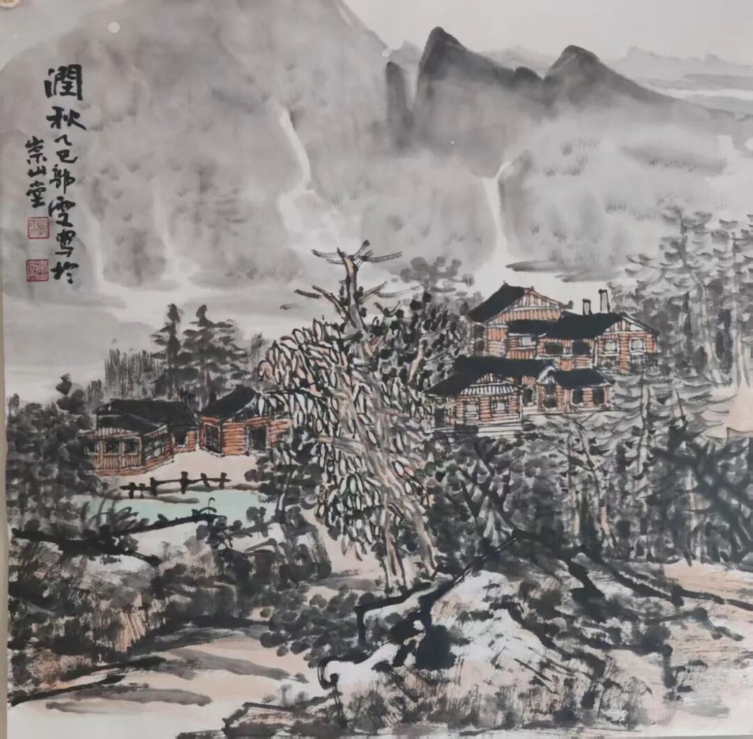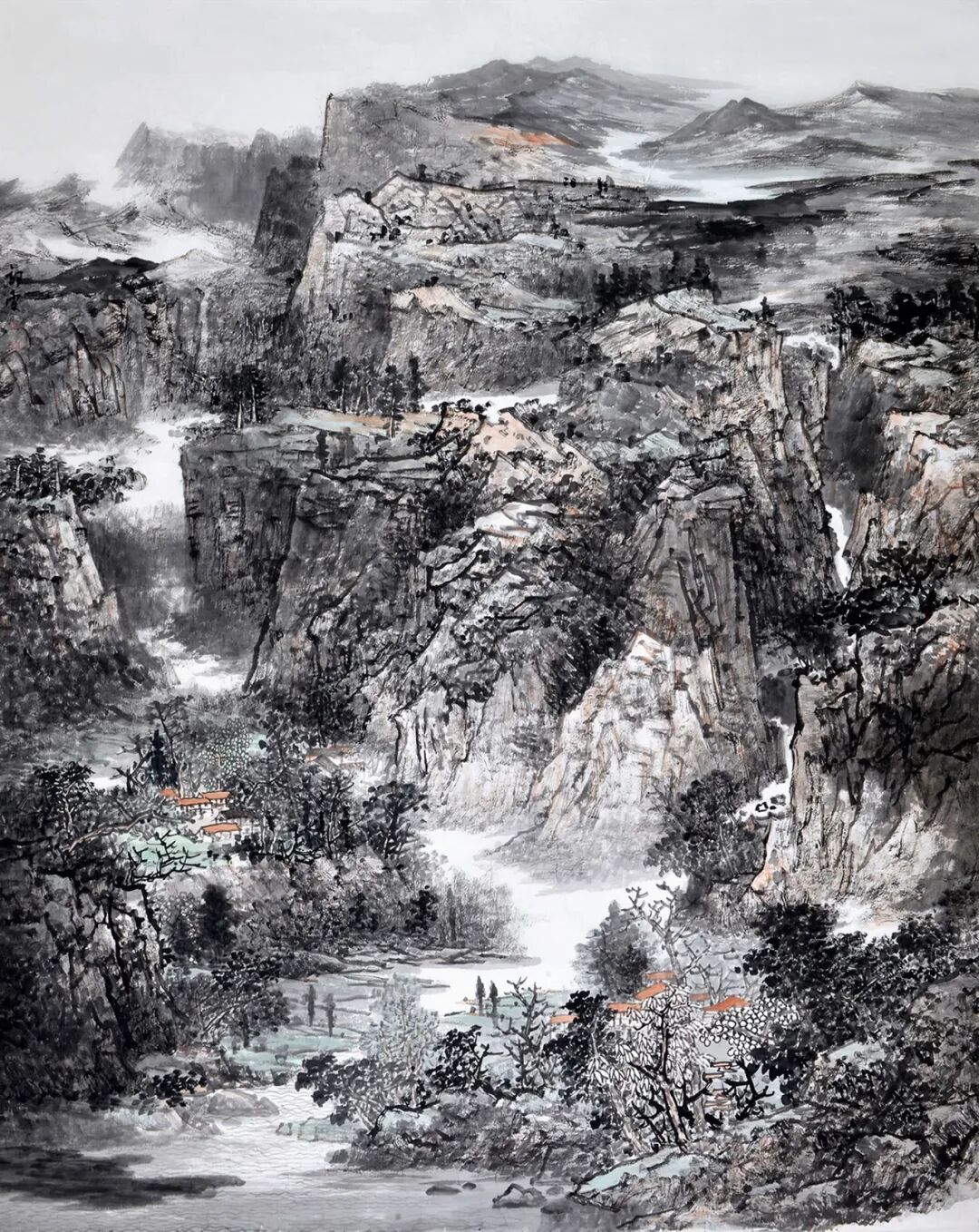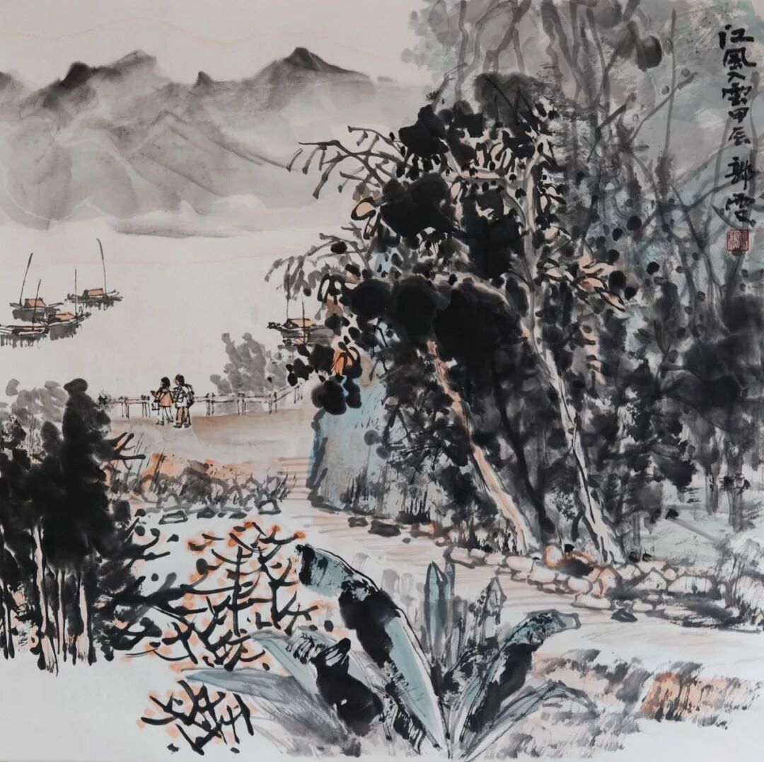 郭雯女士作画,常是从大局落墨,再逐步收拾细节,而这一创作方式,也是为观者带来了层次分明的视觉体验。因画面中山水主体首先成形,所以气势贯通;然细观之下,又有丰富小景隐于其间,使作品既可远望其势,亦可近窥其境。例如在这幅《万壑秋声图》中,她便巧妙地运用了写生中所把握的远视构图,将层峦叠嶂连绵推远,又以一条清河蜿蜒贯穿全图,自远景缓缓流至眼前。沿河茂林掩映民居,云气缭绕缠山脊,再以嶙峋岩石与飒飒秋林为主体,整幅画面真可谓是明净遥落人肃肃,令人不禁想起宋代王禹偁的诗句:“万壑有声含晚籁,数峰无语立斜阳”,深秋意境,跃然纸上!