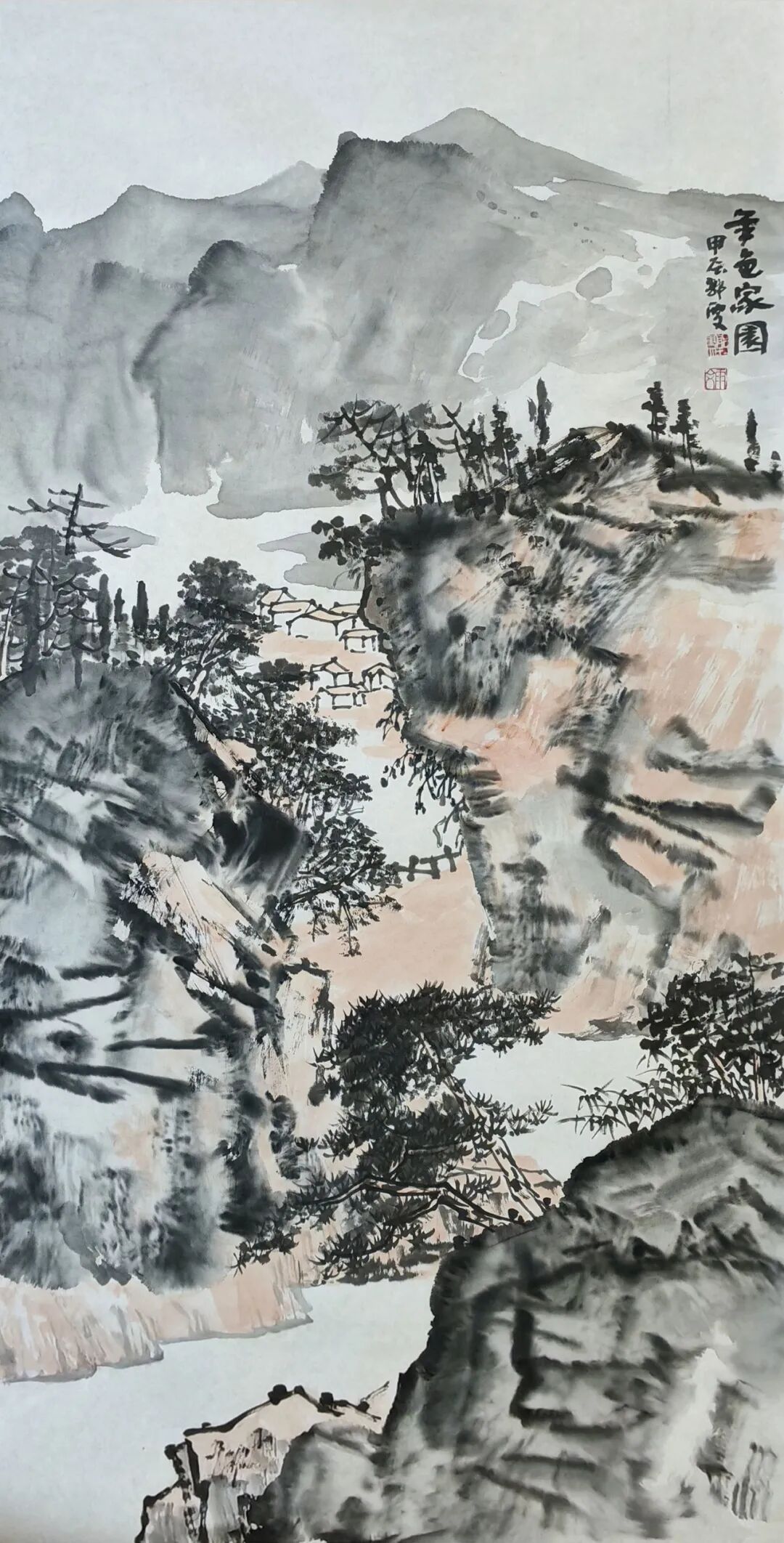 郭雯的笔墨根基深植于传统文人画体系,这一点毋庸置疑。她的画风融贯南北,兼具双方气韵。观其运思用墨,常以水墨留白营造云水氤氲之趣,意境空灵;同时又善用丰富多变的皴法,勾勒出奇峰峻岭的雄浑体势。斧劈皴立山石之骨,横锋侧扫强化岩体质感,再以墨色层层晕染,轻点苔痕,于苍劲中见润泽。这般笔墨语言,恰如古人画论所道:“夏山欲雨,要带水笔晕开。山石加澹螺青于矾头,更觉秀润也!”
