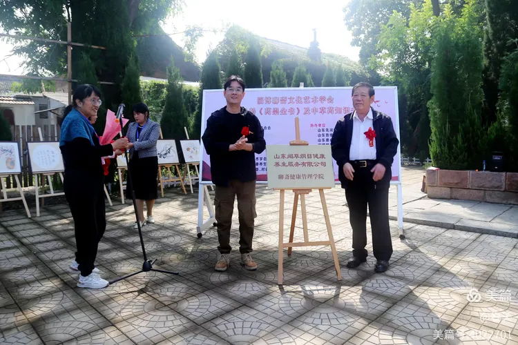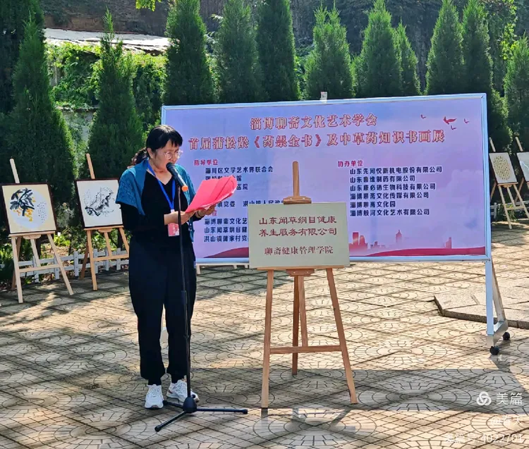 这场盛会的串场人,正是淄博聊斋文化艺术学会副会长兼秘书长阎文红女士。她身着素雅衣装,语调亲和如秋日清泉,主持风格既含乡土的朴实,又藏文人的优雅,更兼处事的大方。介绍嘉宾时,她能精准道出每位贤达与聊斋文化、中医药文化的渊源,寥寥数语便拉近距离;转场衔接处,她又以妙语连珠勾连起“蒲翁著书”与“今日展画”的脉络,让整场活动如一幅徐徐展开的长卷,既流畅自然,又意蕴悠长。没有浮夸的辞藻,却以真诚与才情,让在场者皆感如沐春风,恰是这般润物无声的主持,才让这场文化盛宴更添几分雅致韵味。