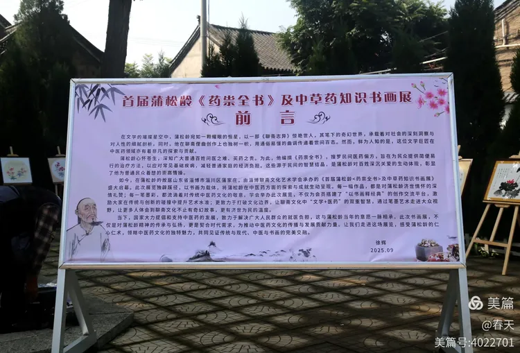 如今,在蒲松龄的故居山东省淄博市淄川区蒲家庄,由淄博聊斋文化艺术学会承办的《首届蒲松龄<药祟全书>及中草药知识书画展》盛大启幕。此次展览独辟蹊径,以书画为载体,将蒲松龄在中医药方面的探索与成就生动呈现。每一幅作品,都是对蒲松龄济世情怀的深情礼赞;每一笔墨彩,都流淌着对传统中医药文化的敬意。学会举办此次展览,不仅为会员搭建了“以书画释经典”的创作交流平台,激励大家在传统与创新的碰撞中提升艺术水准;更致力于打破文化边界,让聊斋文化中“文学+医药”的双重智慧,通过笔墨艺术走进大众视野,让更多人体会到聊斋文化不止有奇幻故事,更有济世为民的温度。