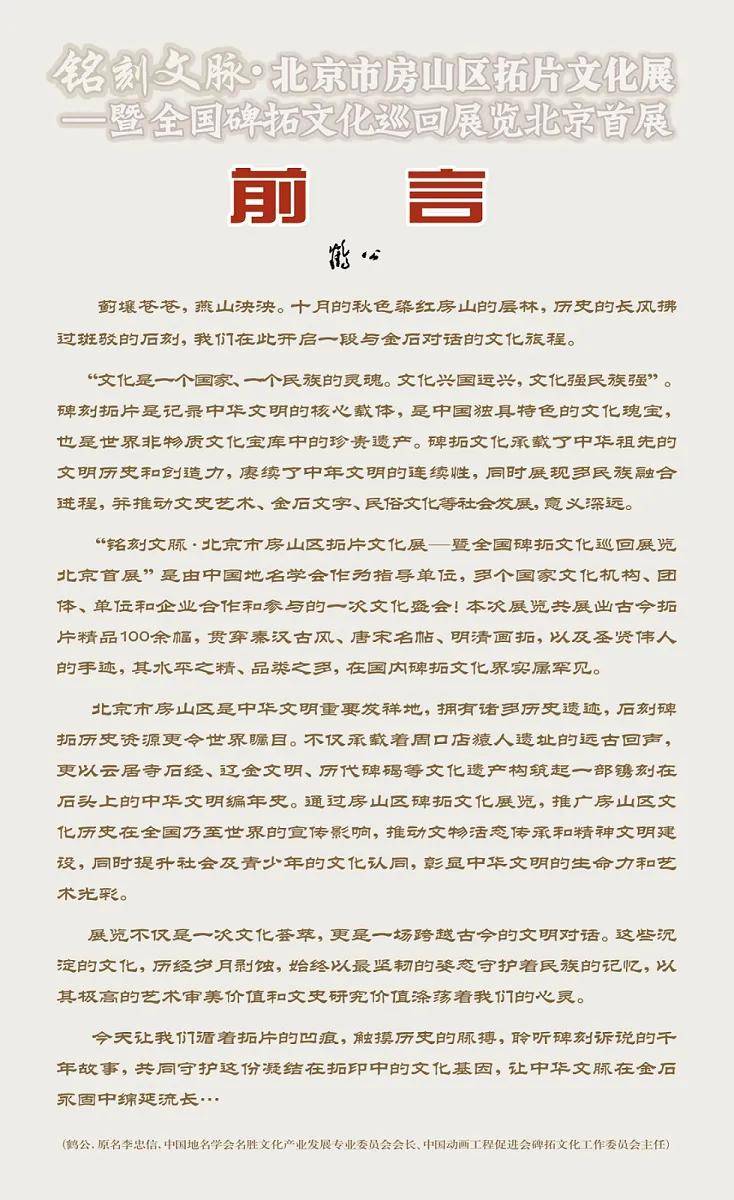 “全国碑拓文化巡回展览”负责人、中国地名学会名胜文化专业委员会会长、中国动画促进会碑拓文化工作委员会主任李忠信先生在前言里阐明了此次全国巡展的深远意义:“蓟壤苍苍,燕山泱泱,历史的长风拂过房山的石刻,也将从这里出发,带着中华碑拓文化的厚重,走向全国每一个角落,让我们开启一场与金石对话的全国文化旅程”。