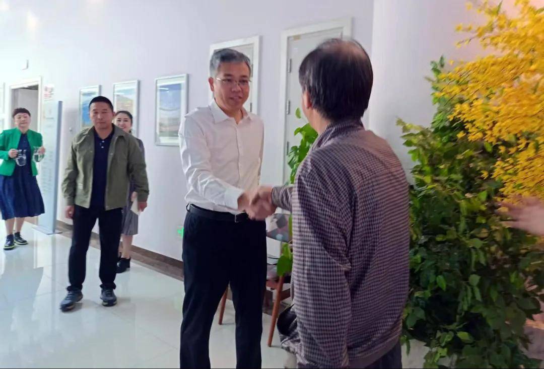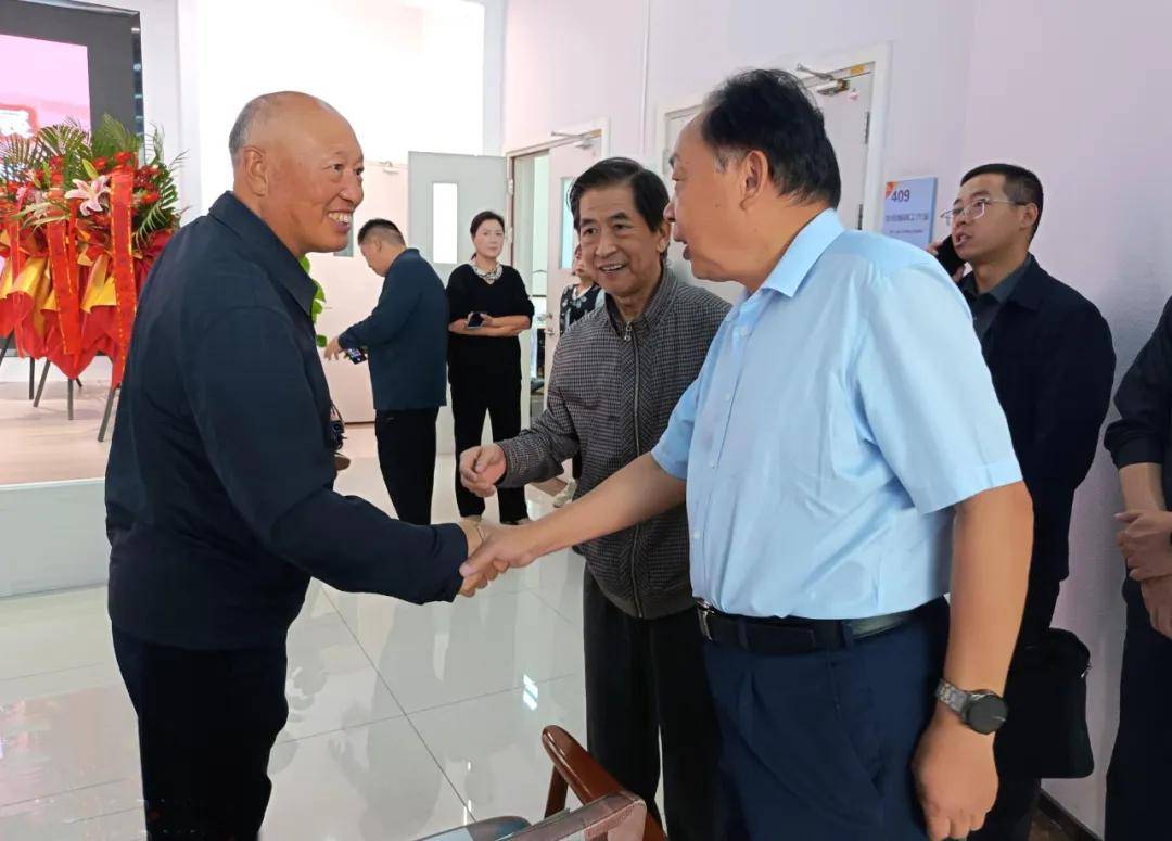 展览活动组委会负责人李忠信(右一)与房山区政府副区长苏震宇(右二)亲切握手。中国碑拓文化工作委员会副主任郭凯(左二)陪同参观。