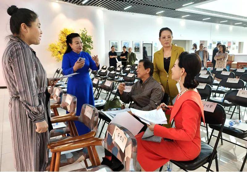 中国名胜文化产业发展工作组委会主任李柠(左一)与中国碑拓文化工作委员会副主任王凤煜(右二)、主持人栢荷(右一)、文化工作者张天云(左二)共同讨论工作。