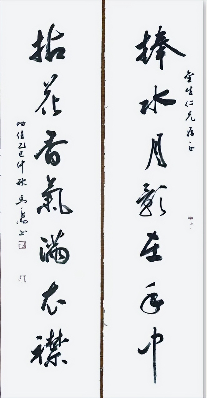 然而,到了晚上,我总感觉有点不对劲,四尺五言对联,字比较大,如果裱好上墙,一下子把我老师邢增庆先生的四尺七言联不就压下去了吗?再说余彝先生的画也比四尺整张小一些,这样一来我的字太突出了,一是感觉对两位先生不礼貌;二是三幅字画挂到那里也不协调。于是,我想干脆把此联在意思不变的情况下,改成七言联吧!我经过思考把对联改成了“捧水月影在手中,拈花香气满衣襟”。10月8日下午,由于下雨,没有外出,在家把此幅对联写好,拍照片通过微信发给了尹哥,并打电话说明了情况,尹哥很高兴,并嘱咐两副对联都要,让我收好!