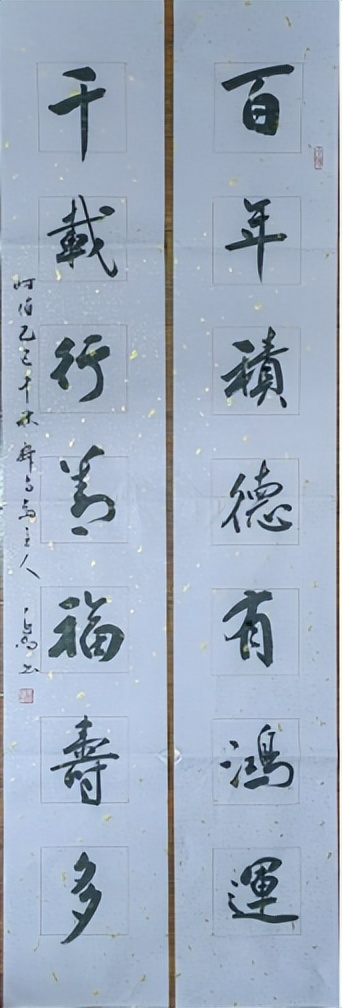 今年尹哥和嫂子已经七十开外,何不写一幅祝寿联给尹哥换换?想到这里,我于是用手机上的百度搜索,一幅老对联被我选中,内容是:“百年积德有鸿运,千载行善福寿多”。10月2日一早起床,先是完成自己的早课,尔后选了一幅四尺竖三开的粉红色对联纸书之,觉得用这种纸比较喜庆,尹哥和嫂子肯定喜欢。早饭后,我把写好的对联拍了照,随后自驾车去看望我的老师邢增庆先生,在和邢老师的交谈中,我拿出手机让邢老师看我近期写的作品,当邢老师看到我的这副对联时,说:“这副对联是一幅老对联,你写的也好,庄重不失灵动,字的大小,笔画的粗细安排的都很到位!”听了邢老师的评价,心里很高兴,心想尹哥也一定很满意。