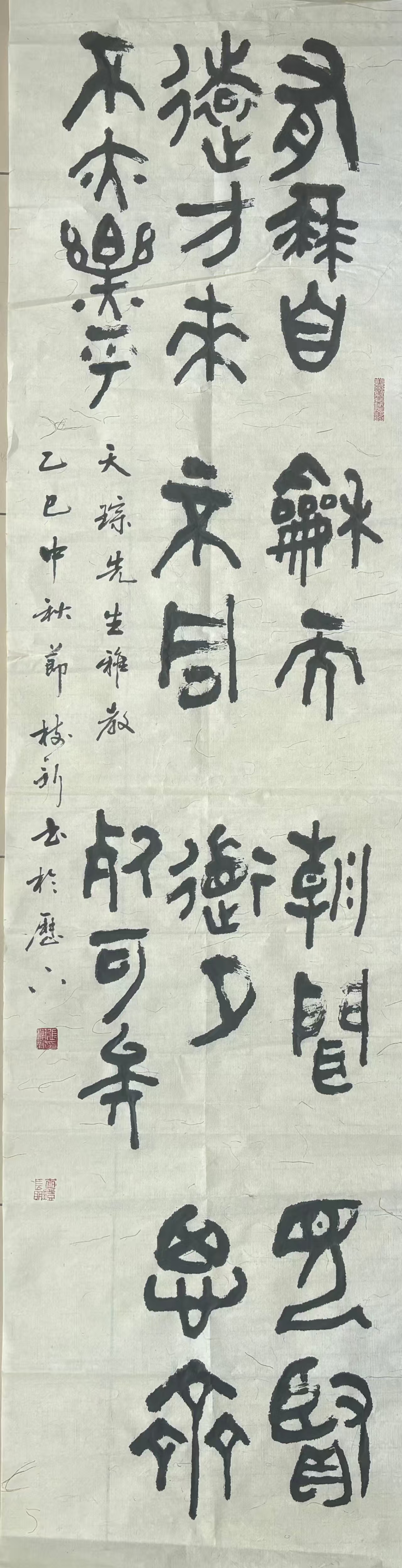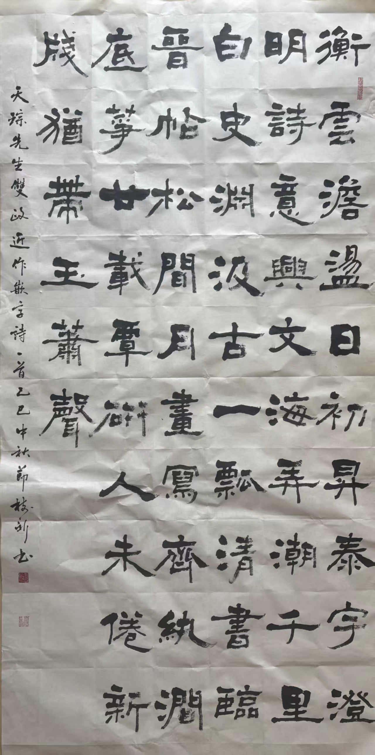 近日,得观山东省文史书画研究会张树新会长惠赠的两幅书法作品——四尺隶书与四尺对开篆书,一幅以藏头嵌字七律展现文心诗境,另一幅以儒家箴言传递千古智慧。这两幅作品不仅是笔墨技艺的展示,更是文化修养与人格修养的完美结合。