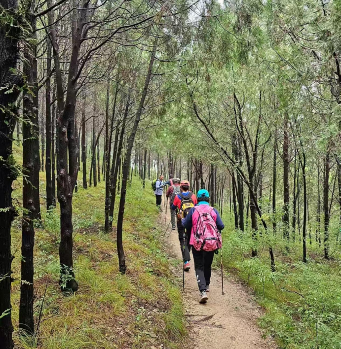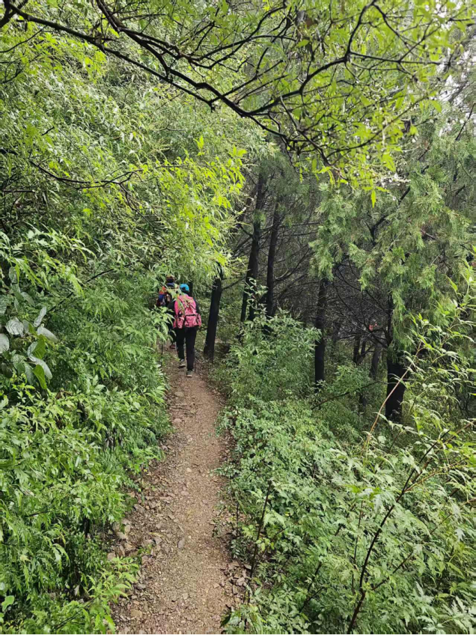 7日7点左右,小雨忽然停了。我心里道,每次爬山,老天爷都很眷顾我们,今次又是,真令人感动。8点多钟,我们8个人的小分队从浆水泉水库东岸上了山。今年的雨水下得勤,库水已经放了几次,现在又快蓄满了,像一大块碧玉似的,看一眼也觉着舒心。这条山路我们经常走,由于是砂石路,所以不难走。松叶被雨水洗濯一新,分外青翠。林间空气清新、湿润,还带着一丝松香味,沁人心脾。路边的小灌木叶子上还挂着晶莹的雨珠,甚是可爱。