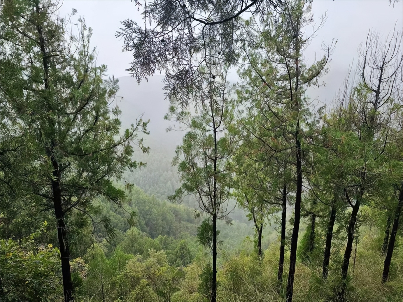 山路比较平缓,在一望无垠的松林里蜿蜒曲折,像一根粗大的绳索似的一眼望不到头。虽然连续地下了几天的小雨,小路上也出现了几处小水湾,却一点也不妨碍行走。山路大都处于陡峭的半山坡上,由于松林茂密,令人丝毫也感觉不到危险,就像走平道一般完全可以放松身心。我偶尔瞥一眼山下,也不知道什么时候,我们已经爬得离山根很高了。那密林幽谷,在淡雾之中深不可测,宛如仙境。
