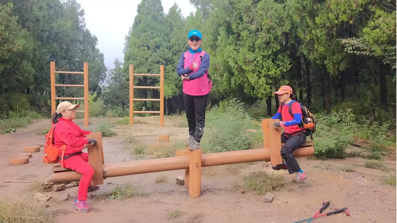 经过大馍馍山、狸猫山、穷山,我们顺利地抵达了“八仙桌”。以前来,还没有跷跷板、以及其他的健身设施,现在增加上了几项,真好!几位女驴友尽管都不年轻了,却像老顽童似的玩起来就没个够。
