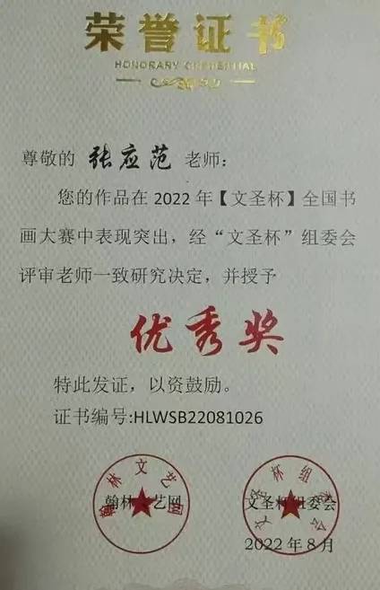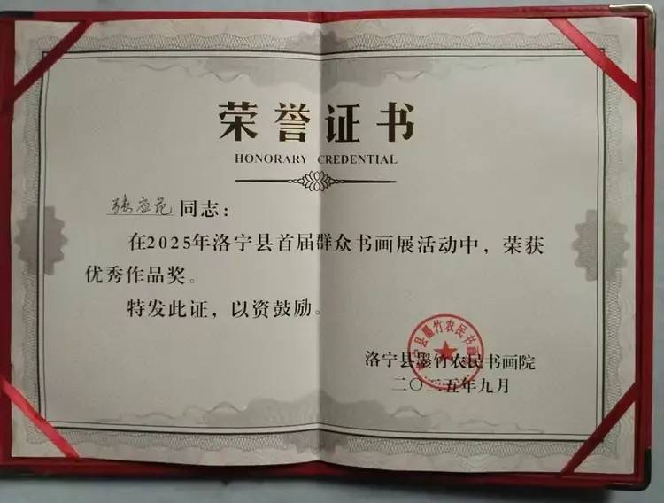 近日,一份散发着墨香的获奖证书,颁发给了底张乡古村村的张应范,以表彰其书法作品入选洛宁县首届群众书画展并得以出版。