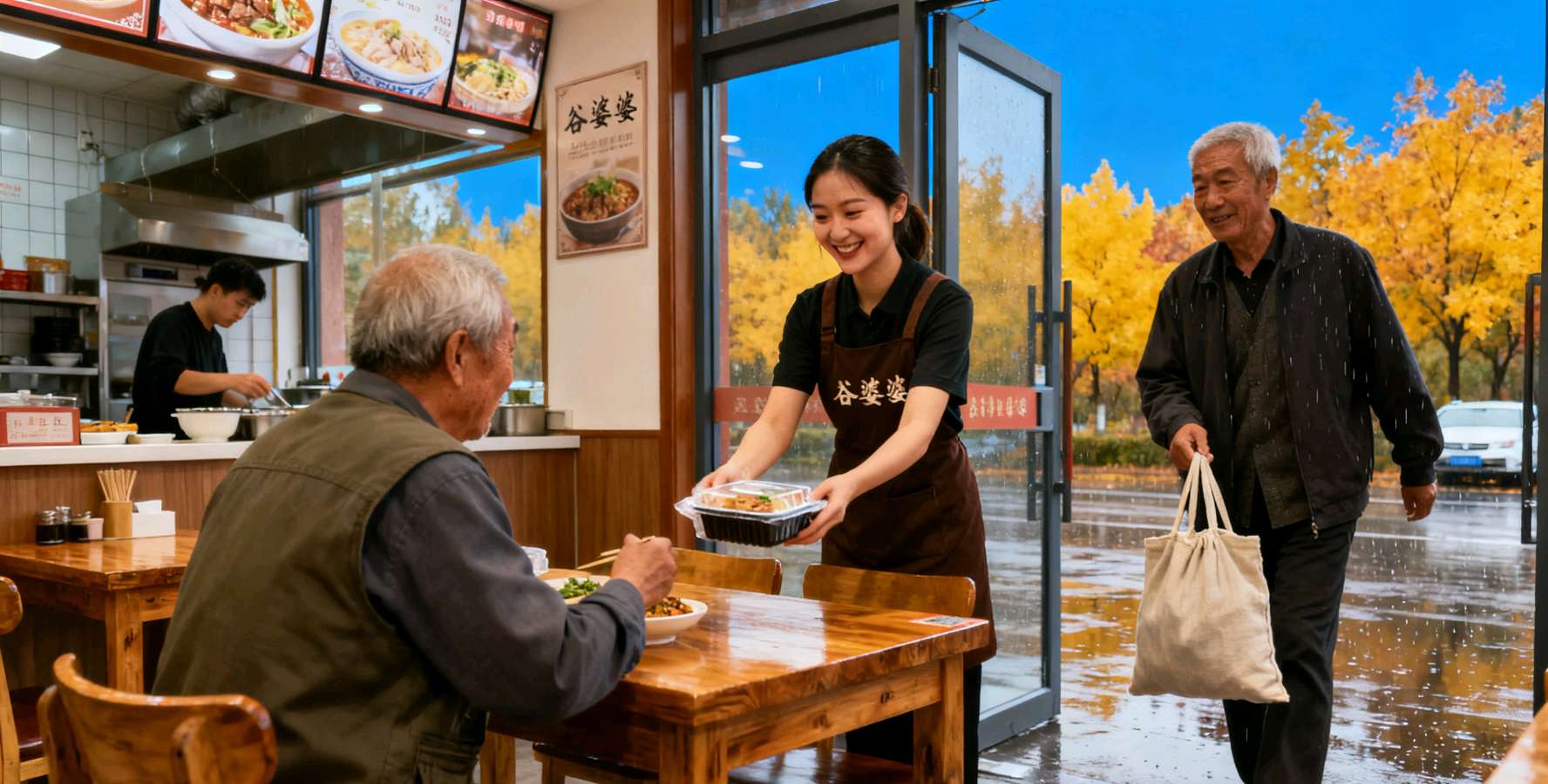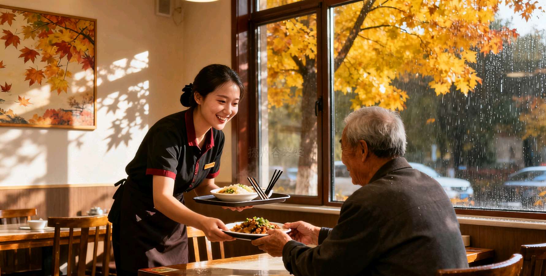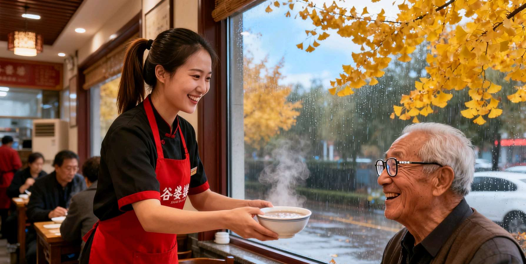 昨天是连绵秋雨天,早上我照例来该店吃饭时对女服务员说的第一句话是:“美女,我看你来了,风雨无阻啊!”