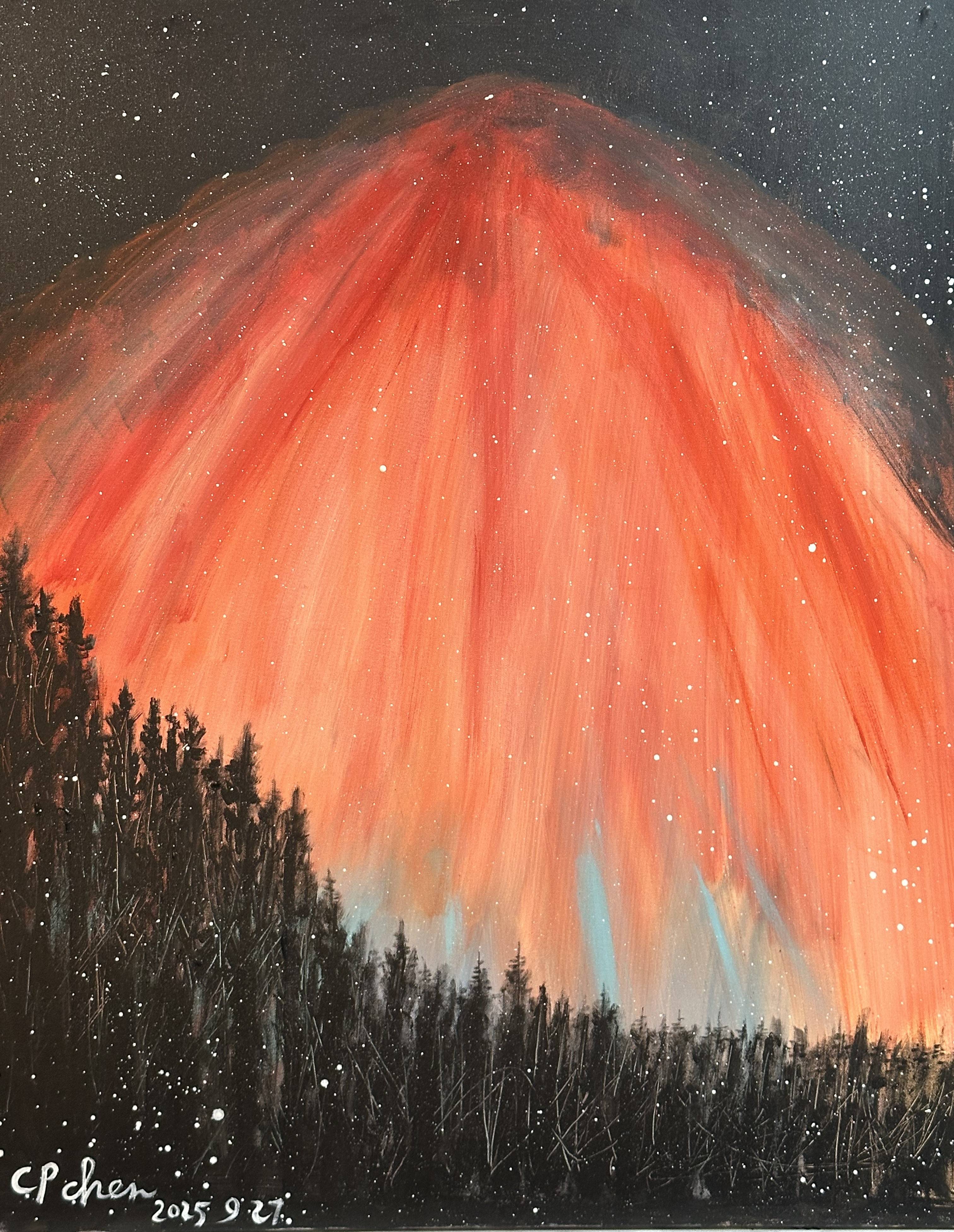当火山的赤红与夜空的幽黑碰撞,当莽莽林海在星子的碎光里静默,陈持平教授的《空寂》以极具张力的视觉语言,将自然的壮美与生命的沉思凝于画布之上。这幅作品,是陈教授对“天地空寂,生命回响”命题的一次精彩诠释。