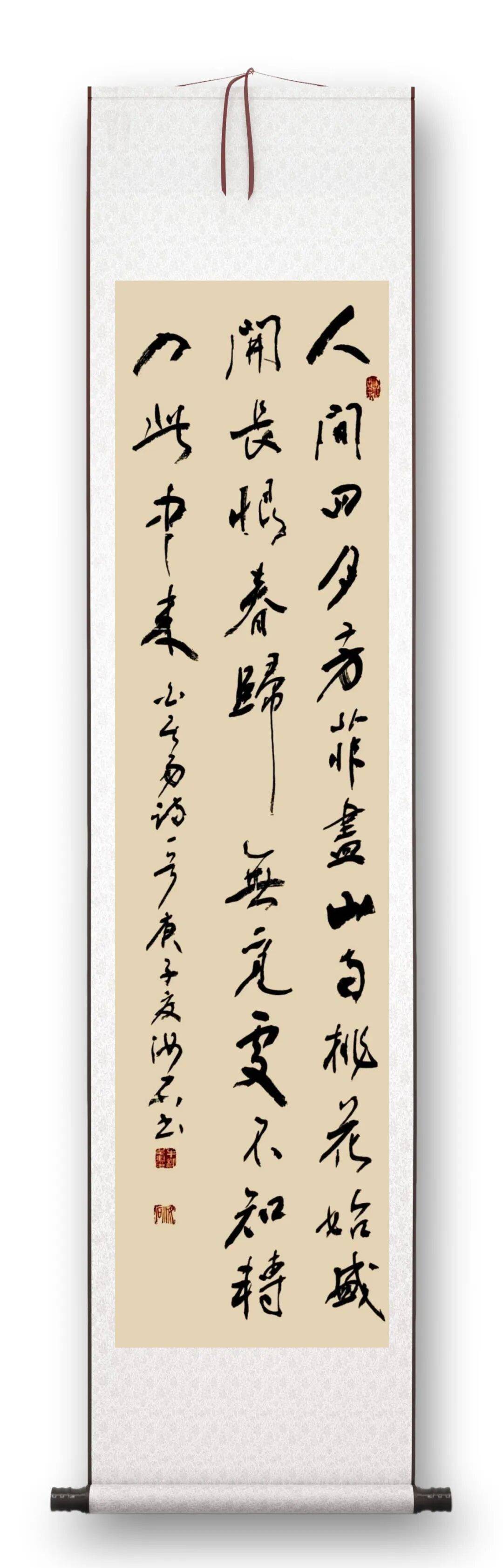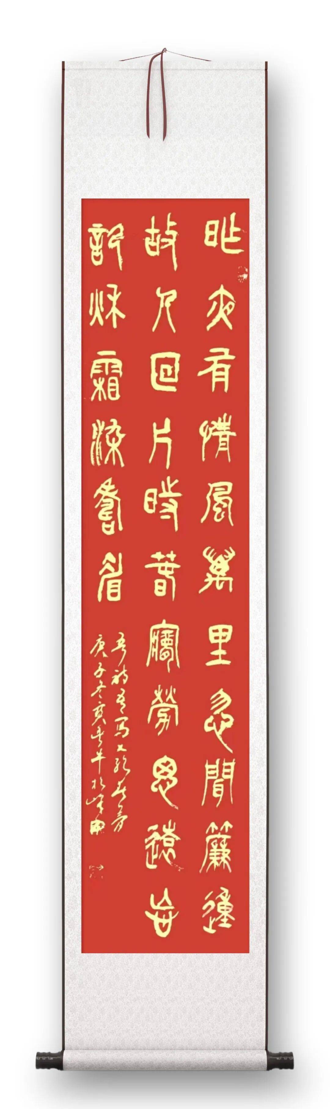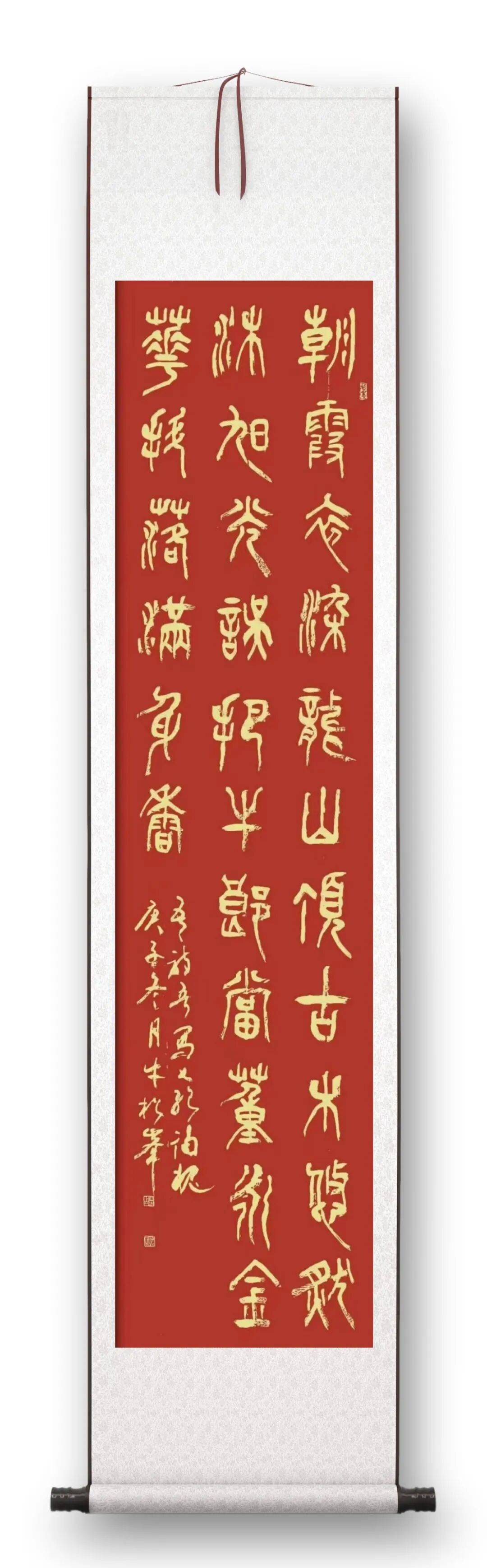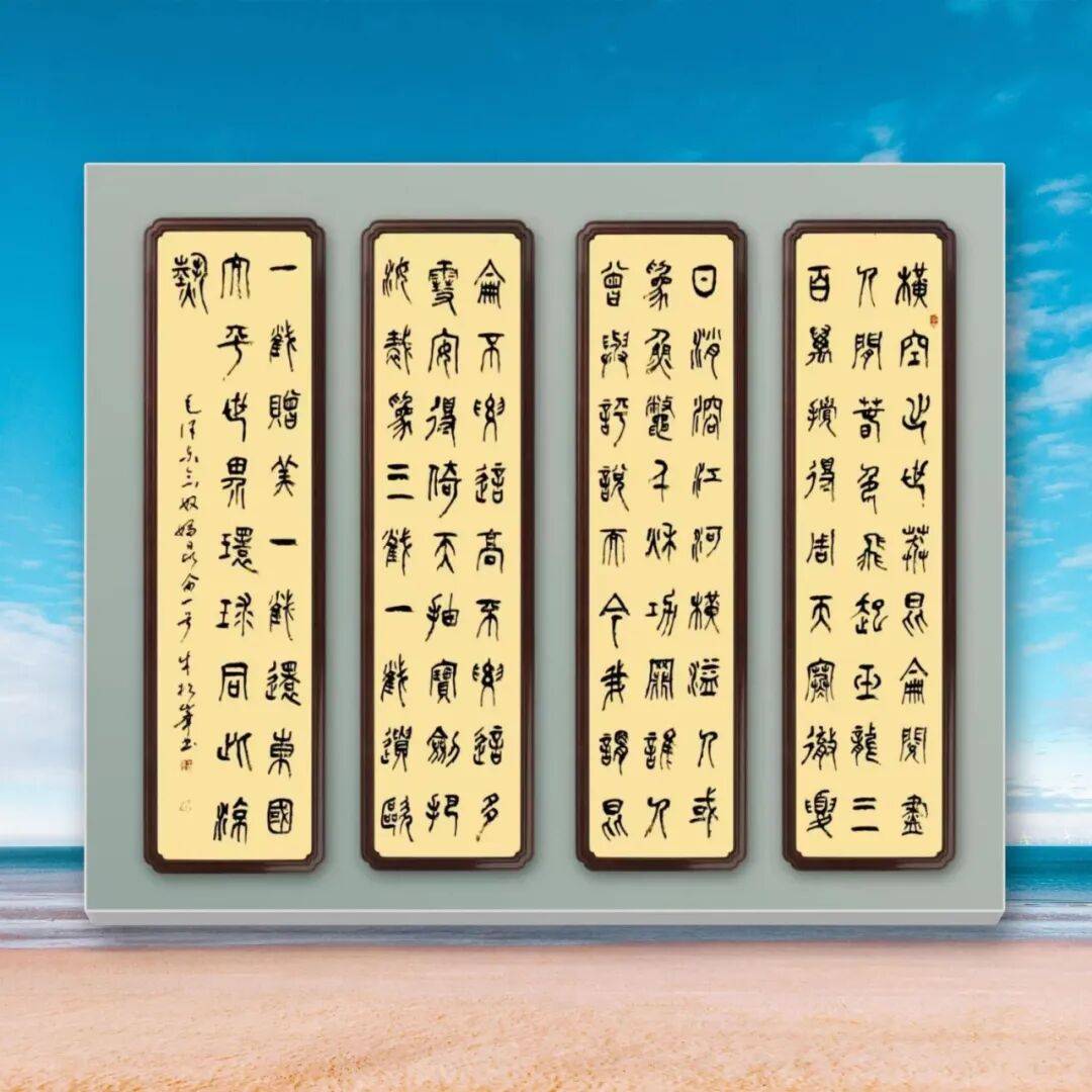 篆书作为古老的汉字书体,笔画规整、线条匀净,有着庄重典雅之美。此作中,字体结构严谨,笔画婉转流畅,粗细变化自然,在规整中又蕴含灵动。牛松峰先生的篆书每一笔都似精心雕琢,展现出书写者对篆书笔法的娴熟驾驭。篆书的古朴庄重与诗词的雄浑气魄相得益彰,仿佛让读者在欣赏书法艺术的同时,也能感受到诗词中那吞吐山河的力量,是书法艺术与诗词文化完美融合的佳作,极具艺术价值与文化内涵。