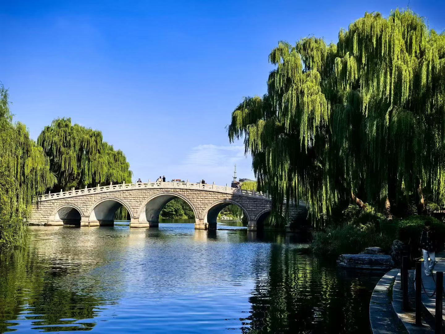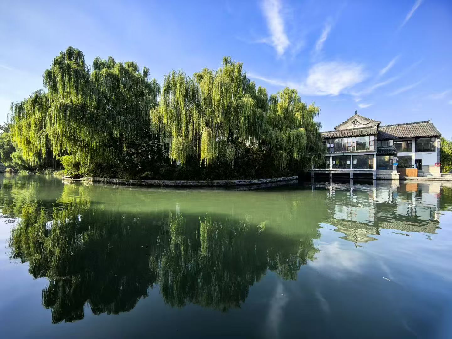 等了半个月,大明湖终于“出浴”了——湖,静静地卧在那里,如一位刚刚出浴的女子。她洗去了半个月的尘嚣与疲惫,通体透着一种清极、静极的韵致。那不是少女的明媚鲜妍,而是一种温婉的、宁馨的成熟风韵,眉宇间含着些许慵懒,又带着新生的洁净,叫人不敢高声,生怕惊扰了她的好梦。